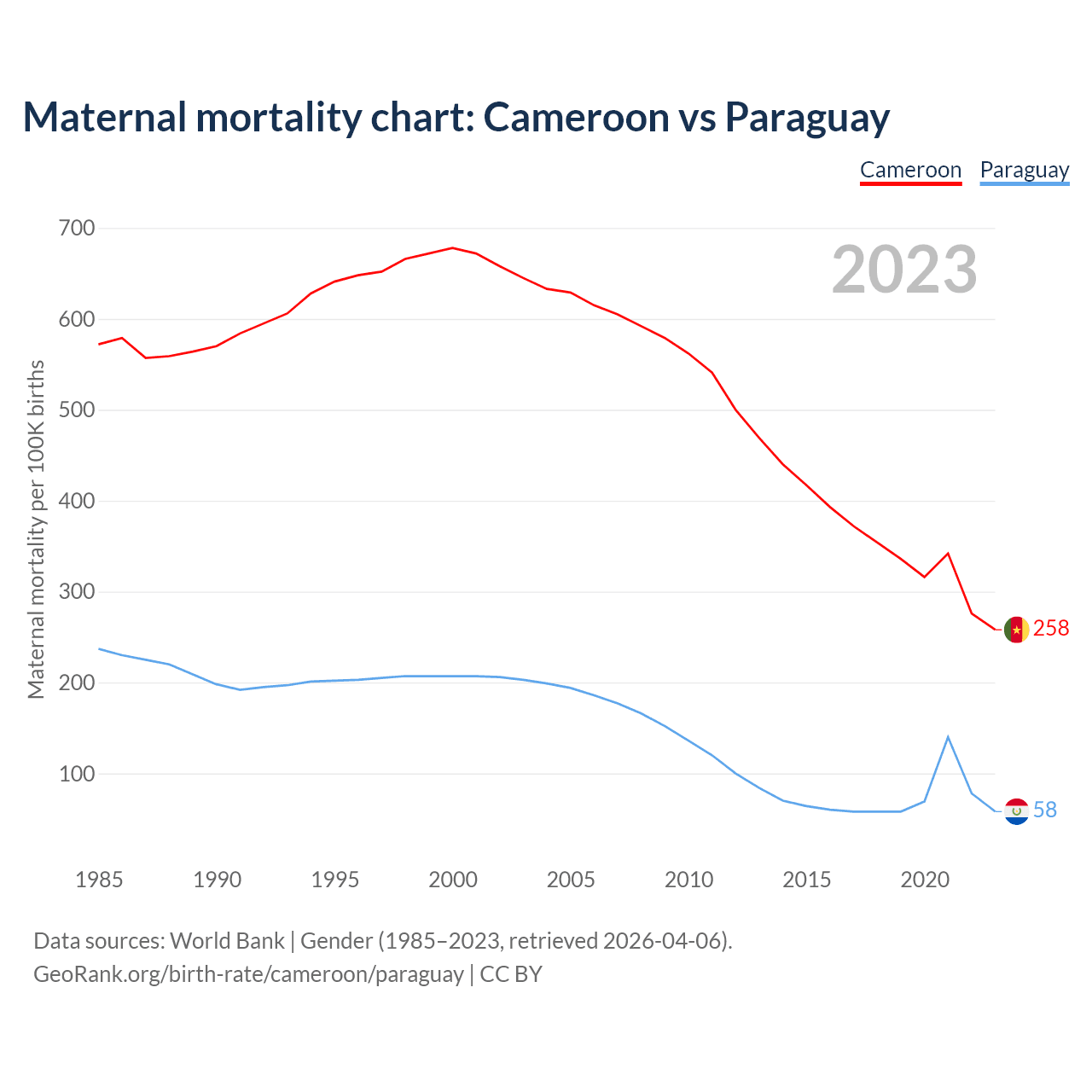 The maternal mortality rate, which is the probability of dying during childbirth or within 42 days of pregnancy termination, is 258 deaths per 100,000 live births in Cameroon, compared to 58 deaths in Paraguay.
