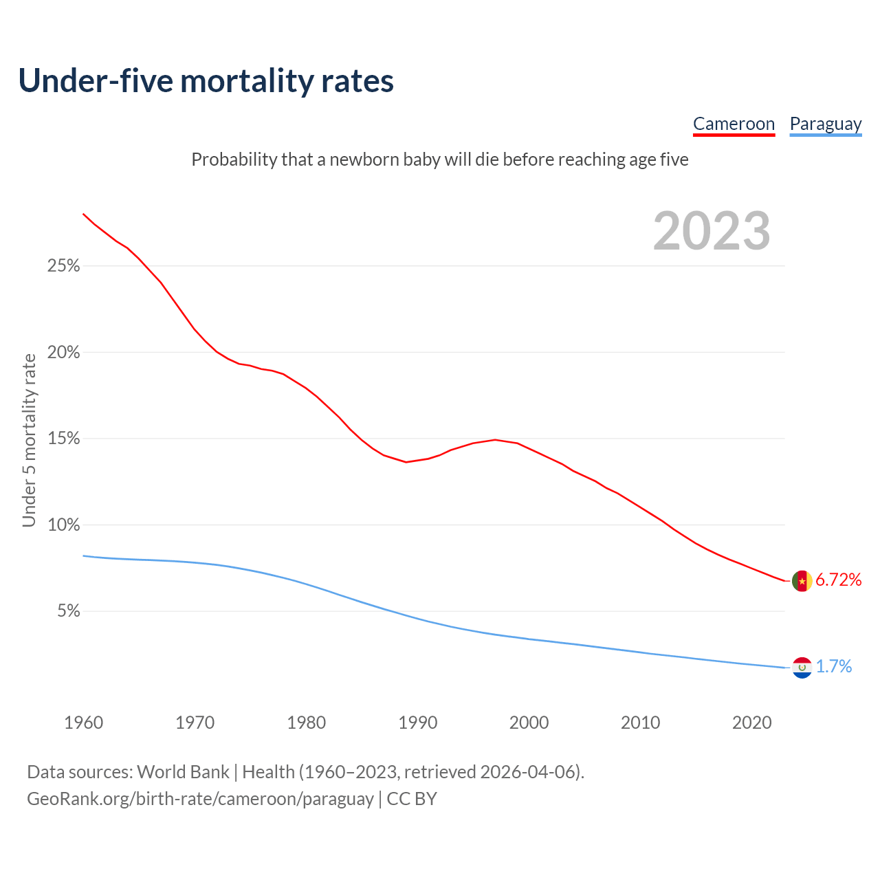 The chance that a newborn baby will die before reaching age five is 6.72% in Cameroon and 1.7% in Paraguay. Above is a chart with historical data on under-five mortality rates.