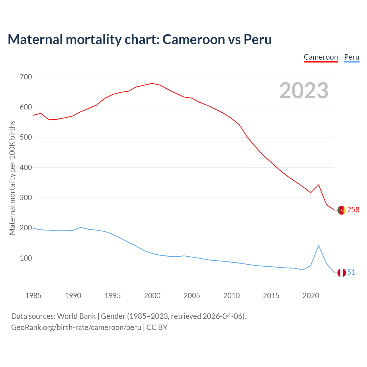 The maternal mortality rate, which is the probability of dying during childbirth or within 42 days of pregnancy termination, is 258 deaths per 100,000 live births in Cameroon, compared to 51 deaths in Peru.