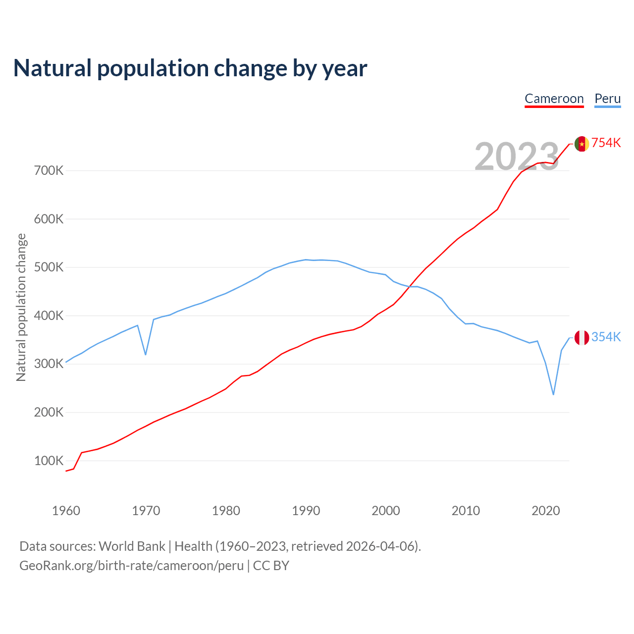 According to the latest available data on birth rates, the fertility rate in Cameroon was 4.32 children per woman in 2023, compared to 1.98 in Peru in 2023. The replacement level is considered to be 2.1 children per woman.