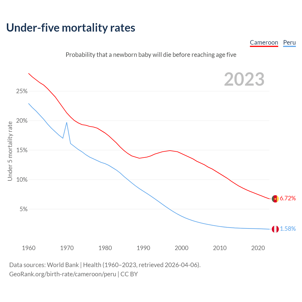 The chance that a newborn baby will die before reaching age five is 6.72% in Cameroon and 1.58% in Peru. Above is a chart with historical data on under-five mortality rates.