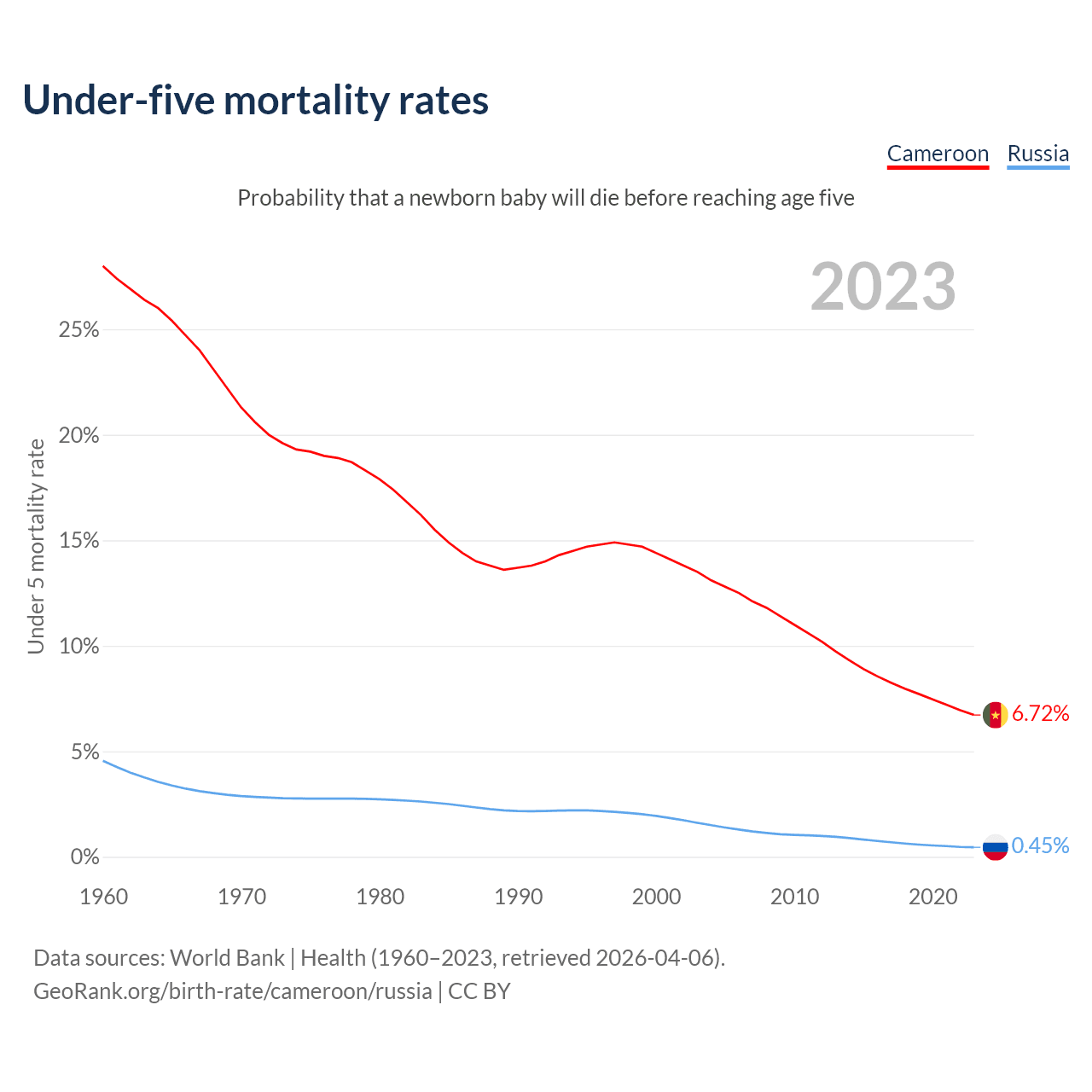 The chance that a newborn baby will die before reaching age five is 6.72% in Cameroon and 0.45% in Russia. Above is a chart with historical data on under-five mortality rates.