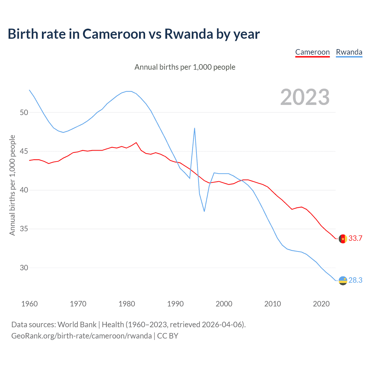 Cameroon has an annual birth rate of 33.7 births per 1,000 people, compared to 28.3 for Rwanda. The average number of children a woman is expected to have during her lifetime — the fertility rate, is 4.32 in Cameroon and 3.7 in Rwanda — 14.4% difference.