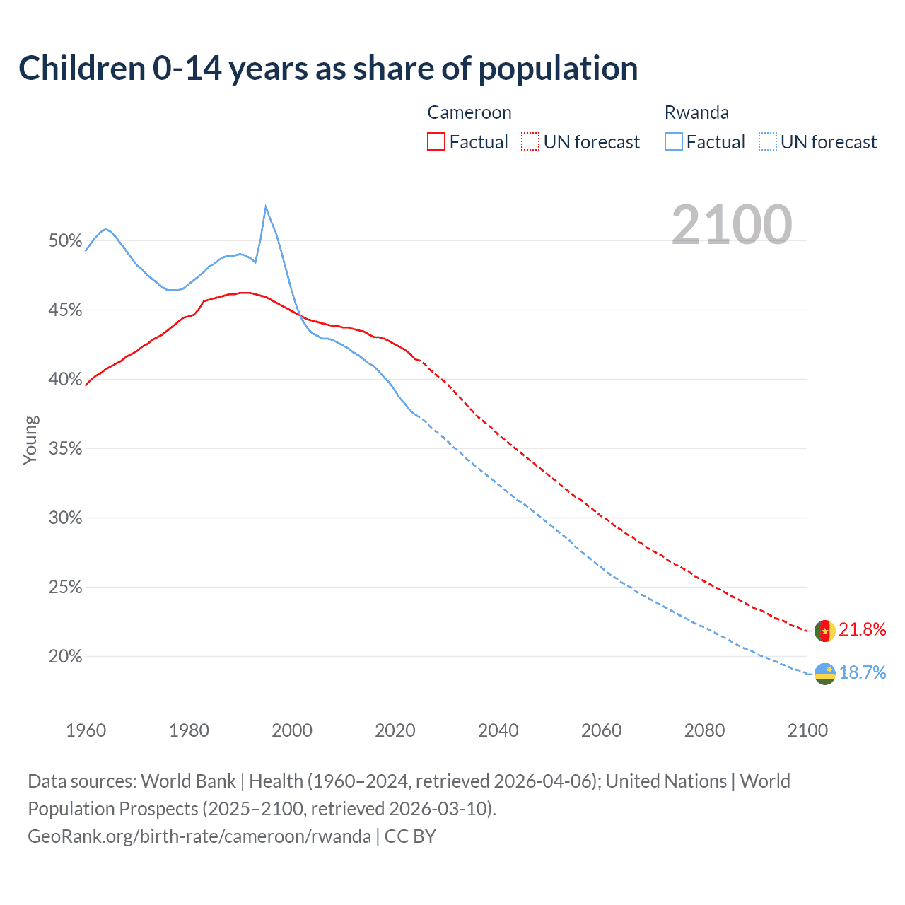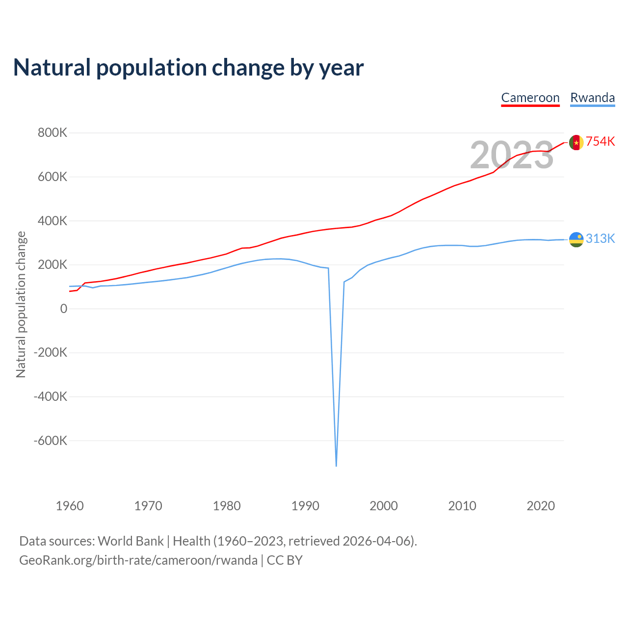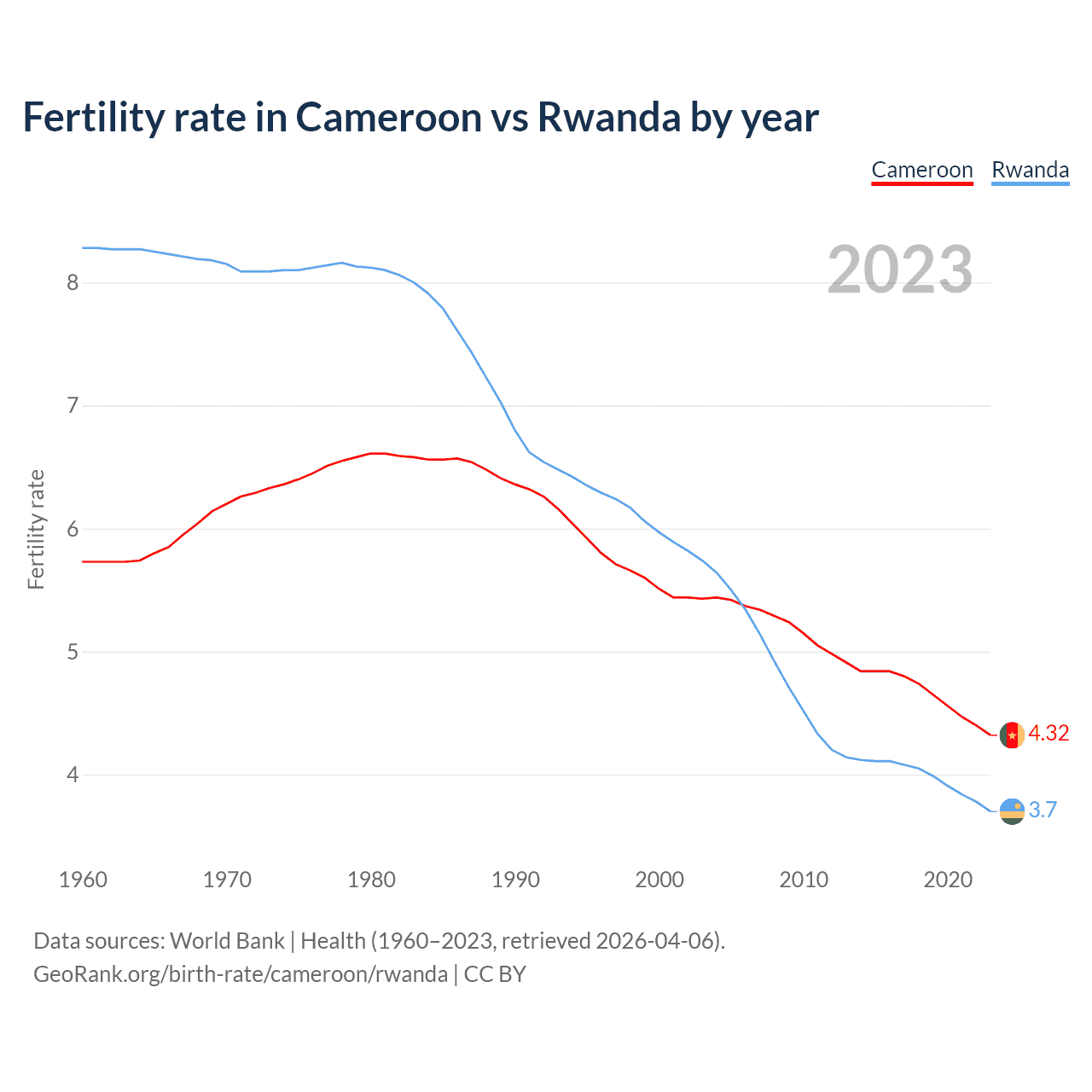 According to the latest available data on birth rates, the fertility rate in Cameroon was 4.32 children per woman in 2023, compared to 3.7 in Rwanda in 2023. The replacement level is considered to be 2.1 children per woman.