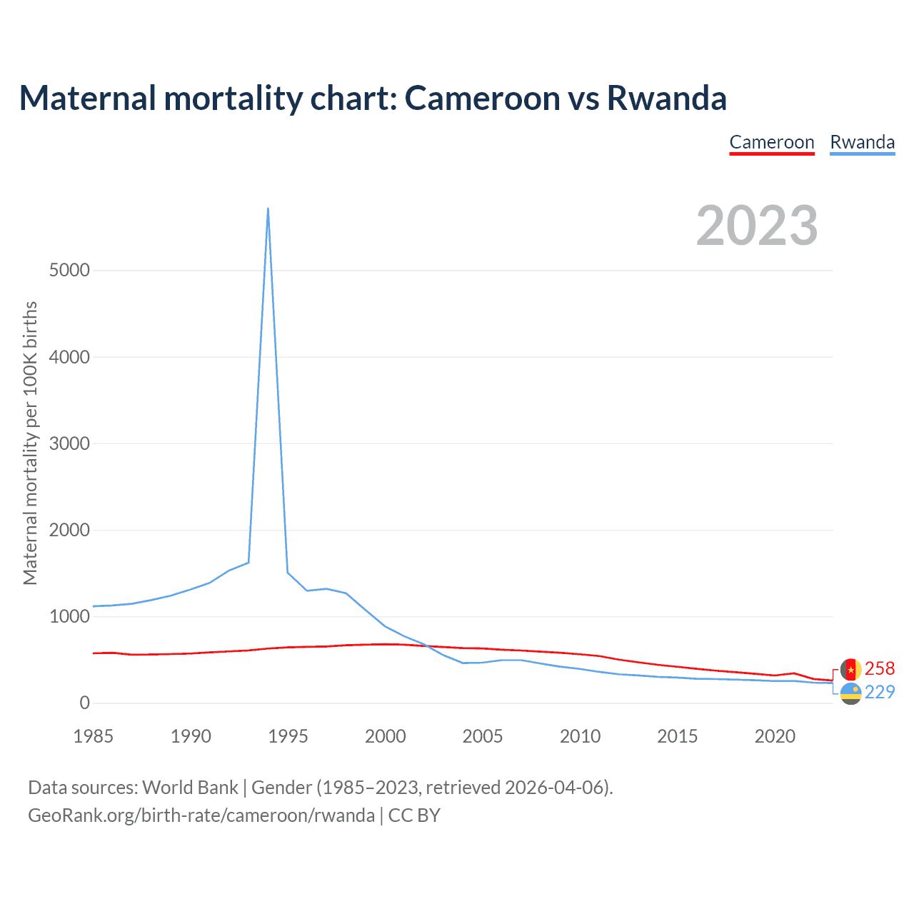 The maternal mortality rate, which is the probability of dying during childbirth or within 42 days of pregnancy termination, is 258 deaths per 100,000 live births in Cameroon, compared to 229 deaths in Rwanda.