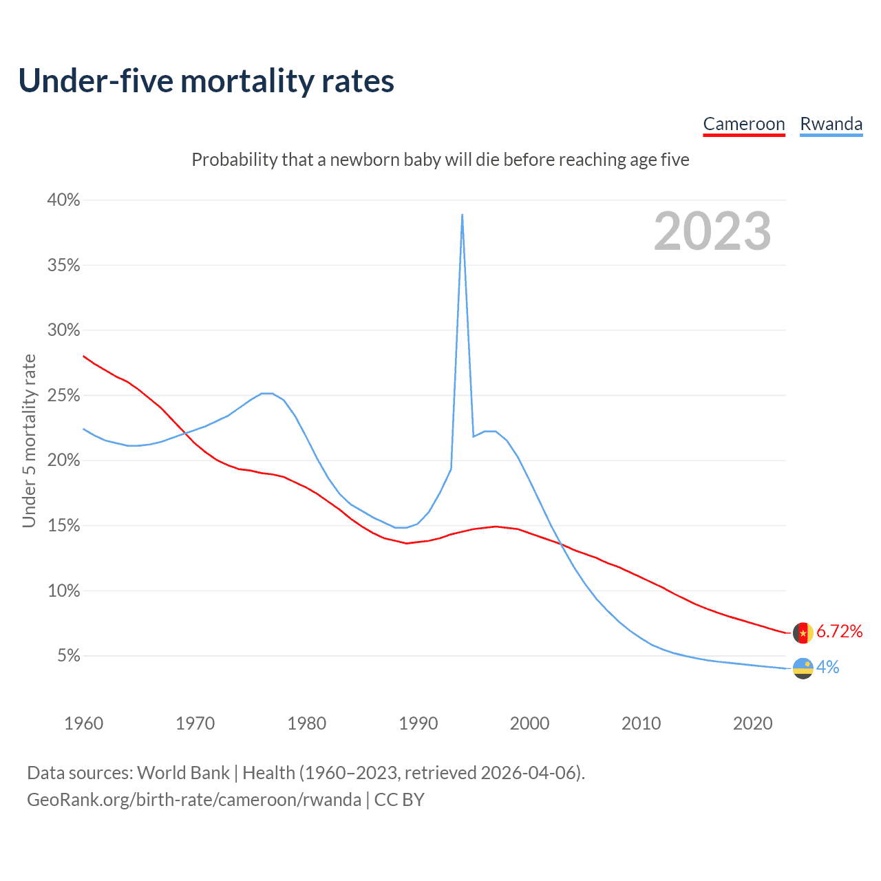 The chance that a newborn baby will die before reaching age five is 6.72% in Cameroon and 4% in Rwanda. Above is a chart with historical data on under-five mortality rates.