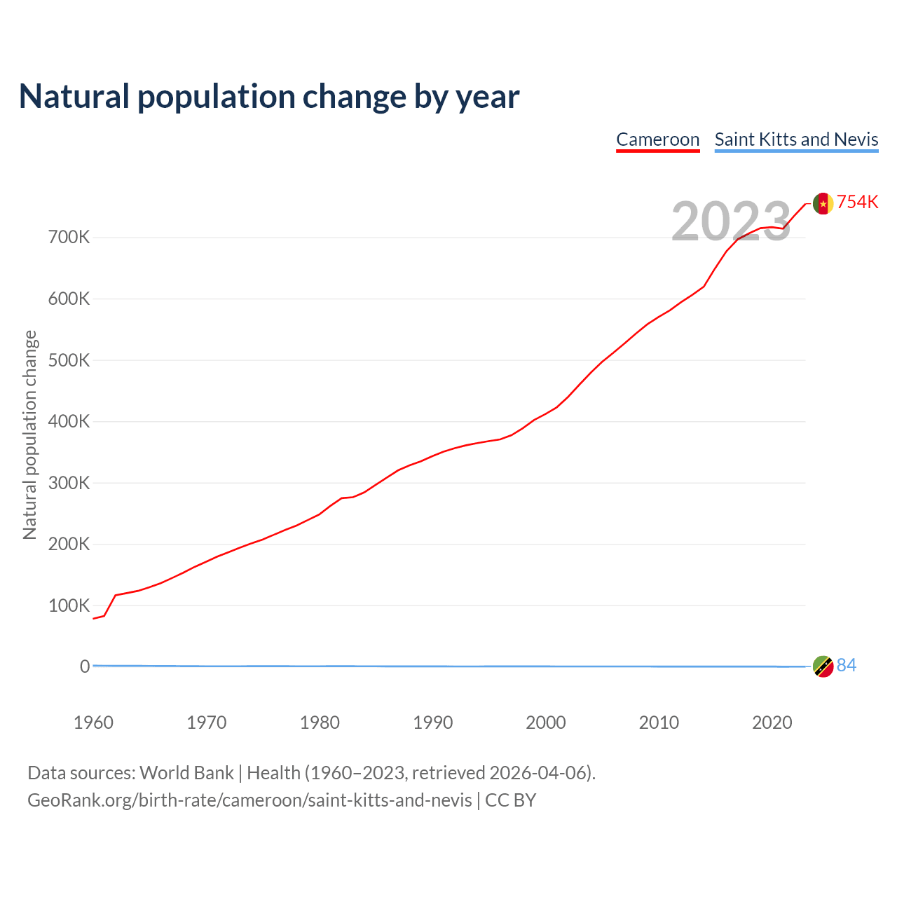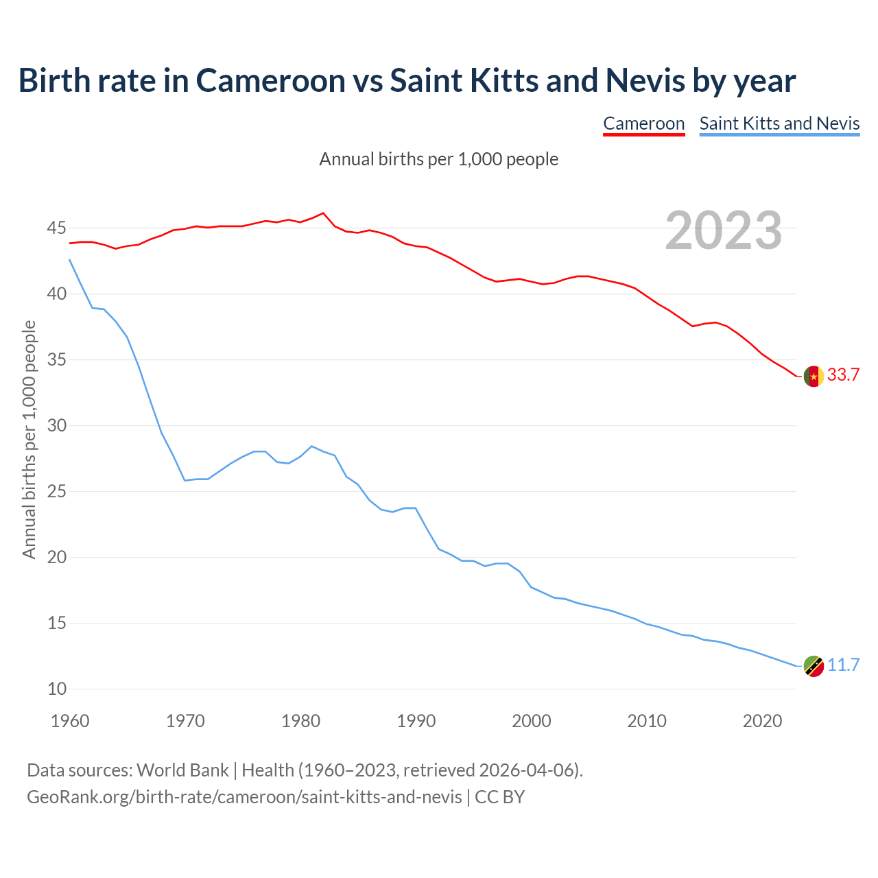 Cameroon has an annual birth rate of 33.7 births per 1,000 people, compared to 11.7 for Saint Kitts and Nevis. The average number of children a woman is expected to have during her lifetime — the fertility rate, is 4.32 in Cameroon and 1.51 in Saint Kitts and Nevis — 65.2% difference.