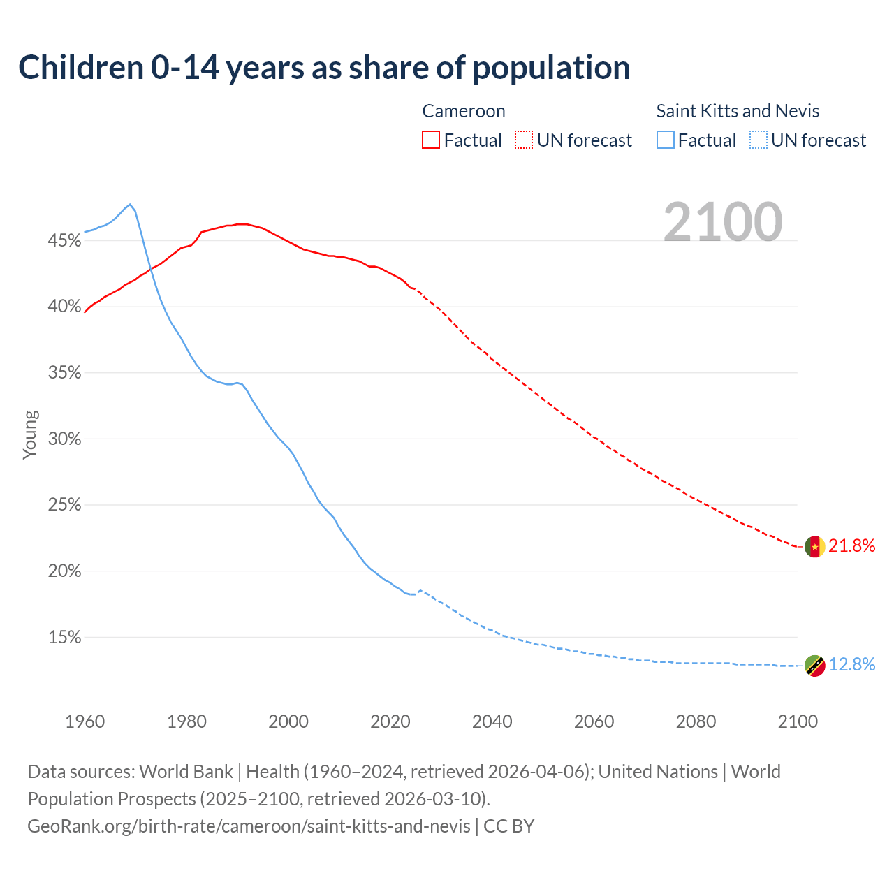 According to the latest available data on birth rates, the fertility rate in Cameroon was 4.32 children per woman in 2023, compared to 1.51 in Saint Kitts and Nevis in 2023. The replacement level is considered to be 2.1 children per woman.
