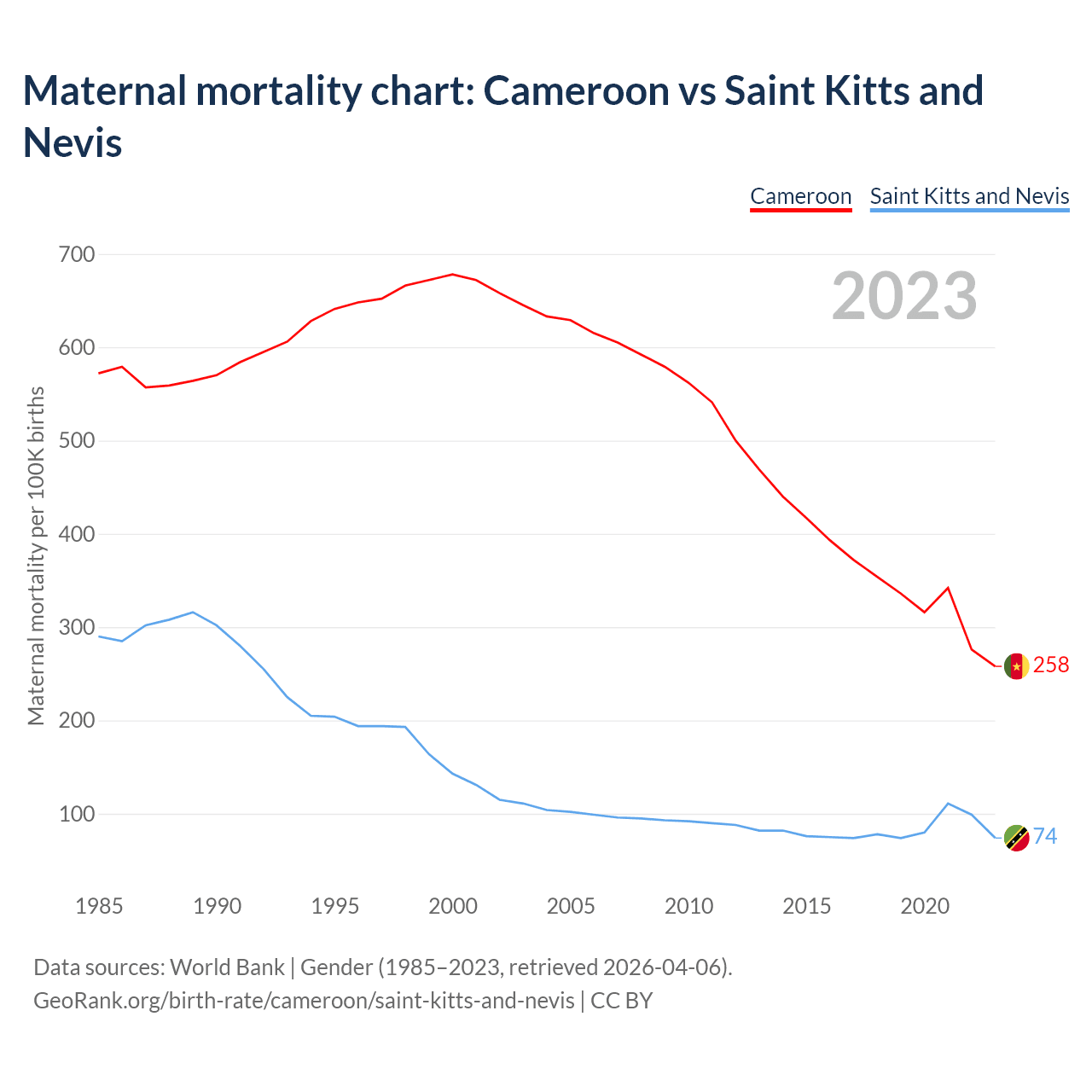 The maternal mortality rate, which is the probability of dying during childbirth or within 42 days of pregnancy termination, is 258 deaths per 100,000 live births in Cameroon, compared to 74 deaths in Saint Kitts and Nevis.