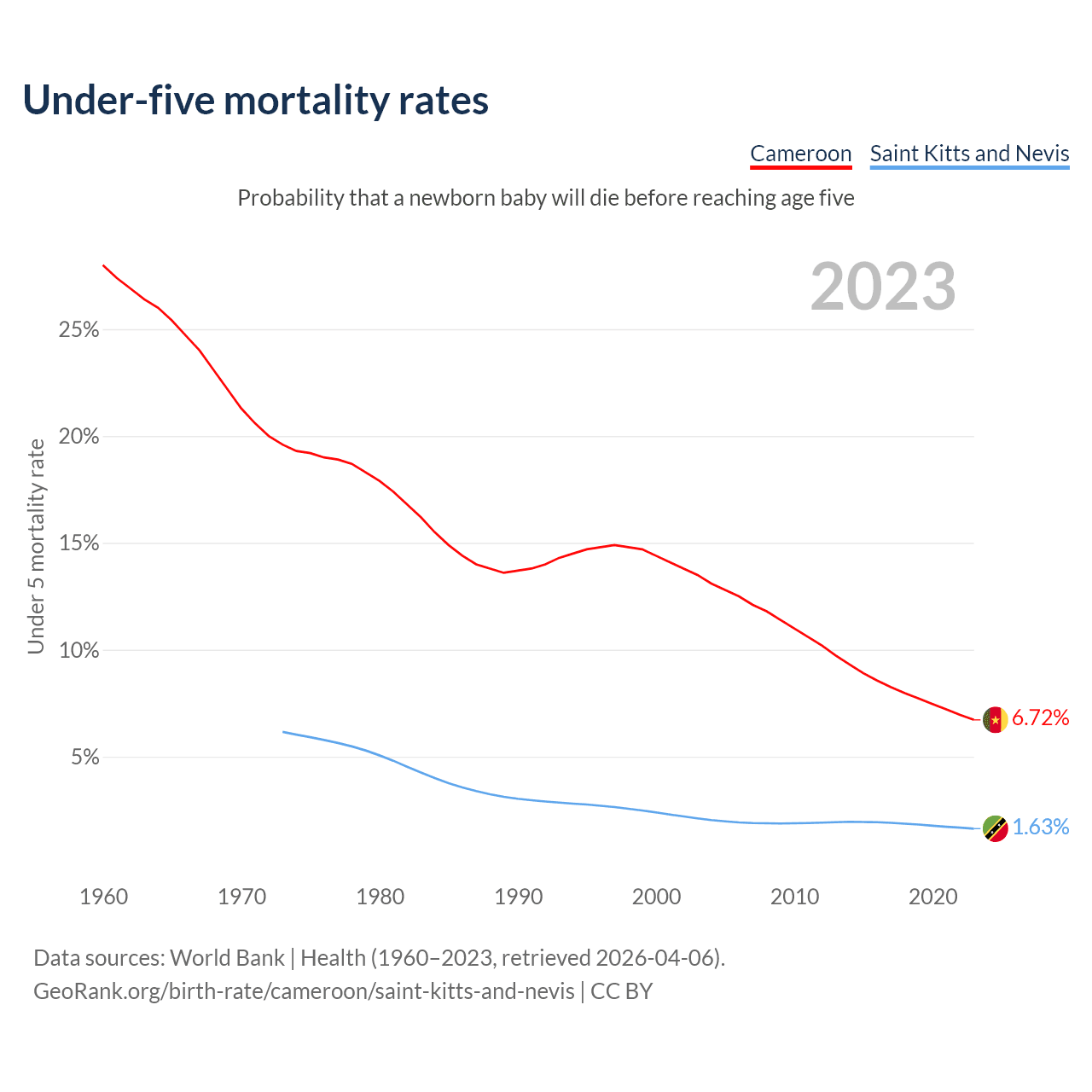 The chance that a newborn baby will die before reaching age five is 6.72% in Cameroon and 1.63% in Saint Kitts and Nevis. Above is a chart with historical data on under-five mortality rates.