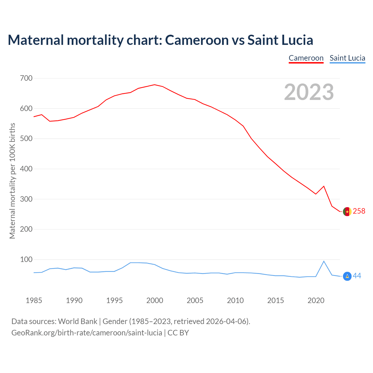The maternal mortality rate, which is the probability of dying during childbirth or within 42 days of pregnancy termination, is 258 deaths per 100,000 live births in Cameroon, compared to 44 deaths in Saint Lucia.