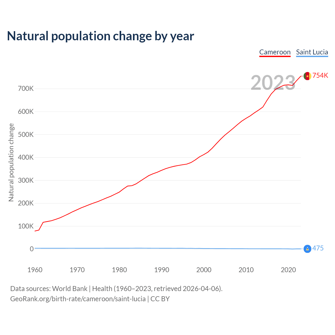 Cameroon has an annual birth rate of 33.7 births per 1,000 people, compared to 11.3 for Saint Lucia. The average number of children a woman is expected to have during her lifetime — the fertility rate, is 4.32 in Cameroon and 1.38 in Saint Lucia — 68.1% difference.
