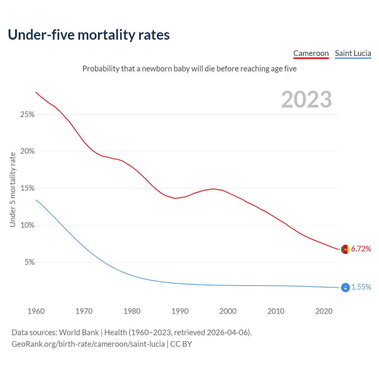The chance that a newborn baby will die before reaching age five is 6.72% in Cameroon and 1.55% in Saint Lucia. Above is a chart with historical data on under-five mortality rates.