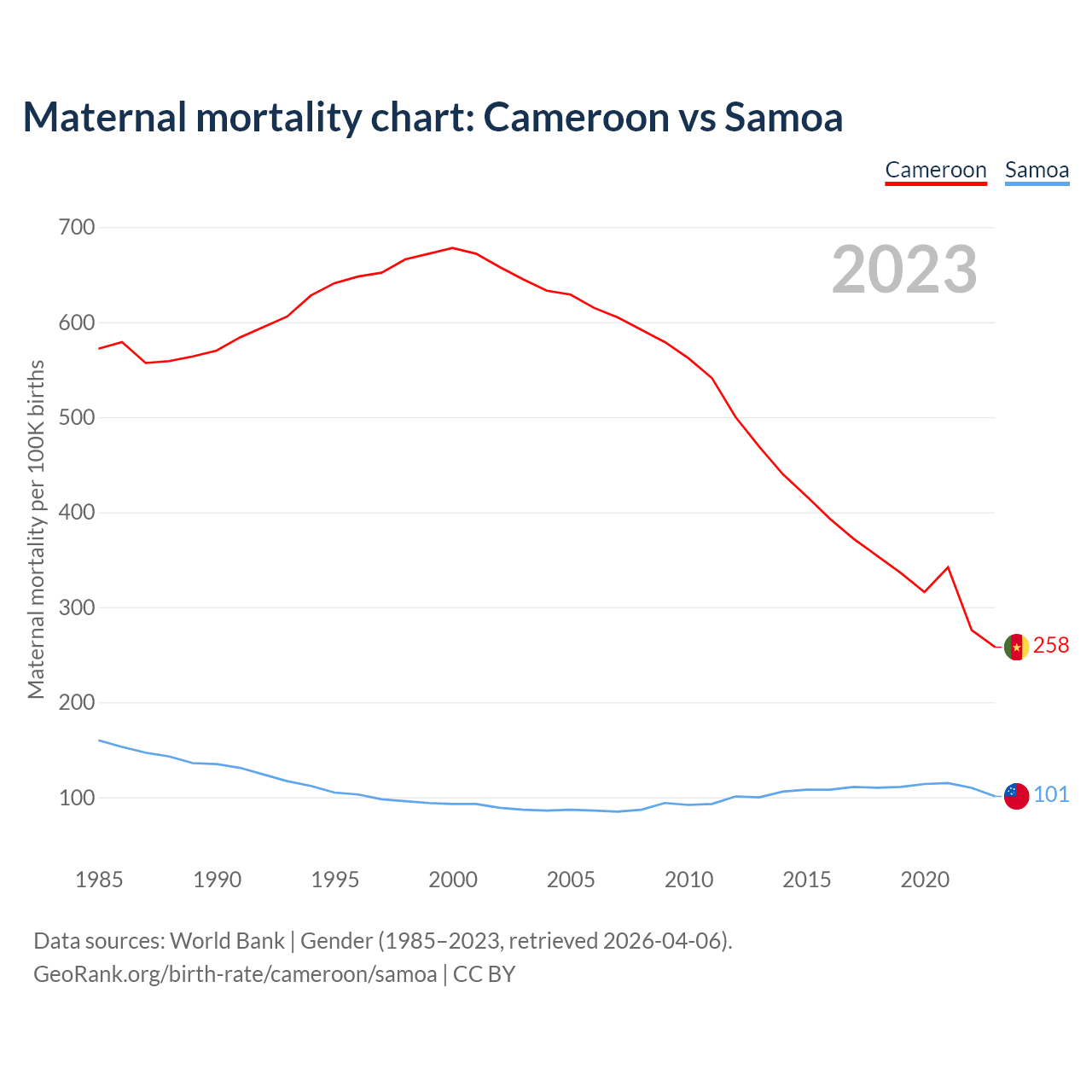 The maternal mortality rate, which is the probability of dying during childbirth or within 42 days of pregnancy termination, is 258 deaths per 100,000 live births in Cameroon, compared to 101 deaths in Samoa.
