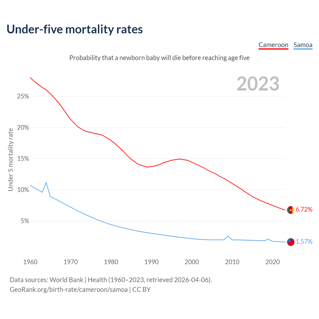 The chance that a newborn baby will die before reaching age five is 6.72% in Cameroon and 1.57% in Samoa. Above is a chart with historical data on under-five mortality rates.