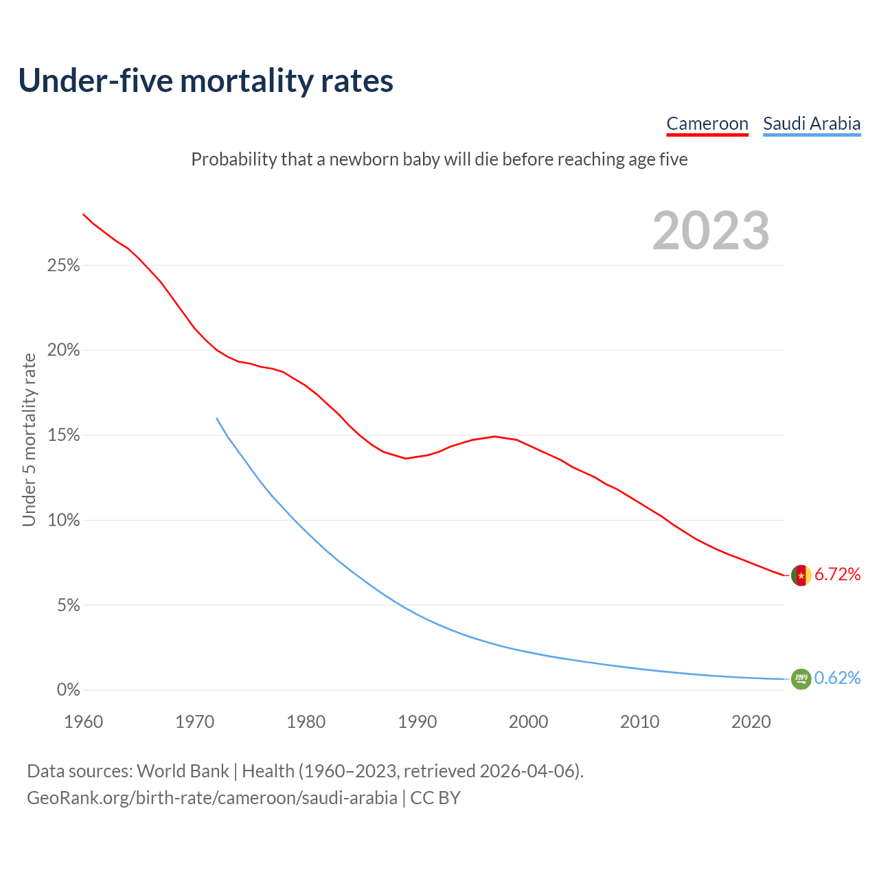 The chance that a newborn baby will die before reaching age five is 6.72% in Cameroon and 0.62% in Saudi Arabia. Above is a chart with historical data on under-five mortality rates.