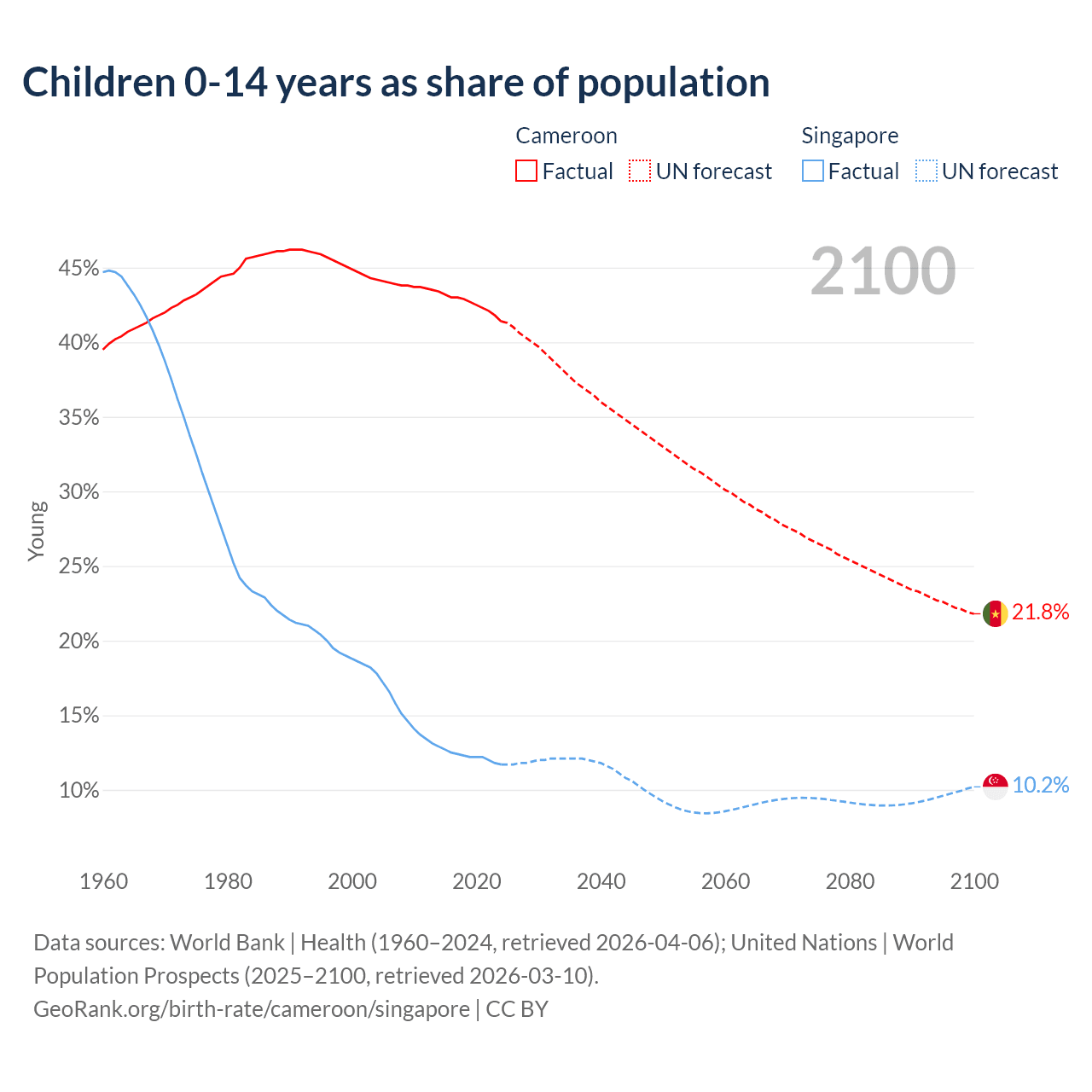 According to the latest available data on birth rates, the fertility rate in Cameroon was 4.32 children per woman in 2023, compared to 0.97 in Singapore in 2023. The replacement level is considered to be 2.1 children per woman.