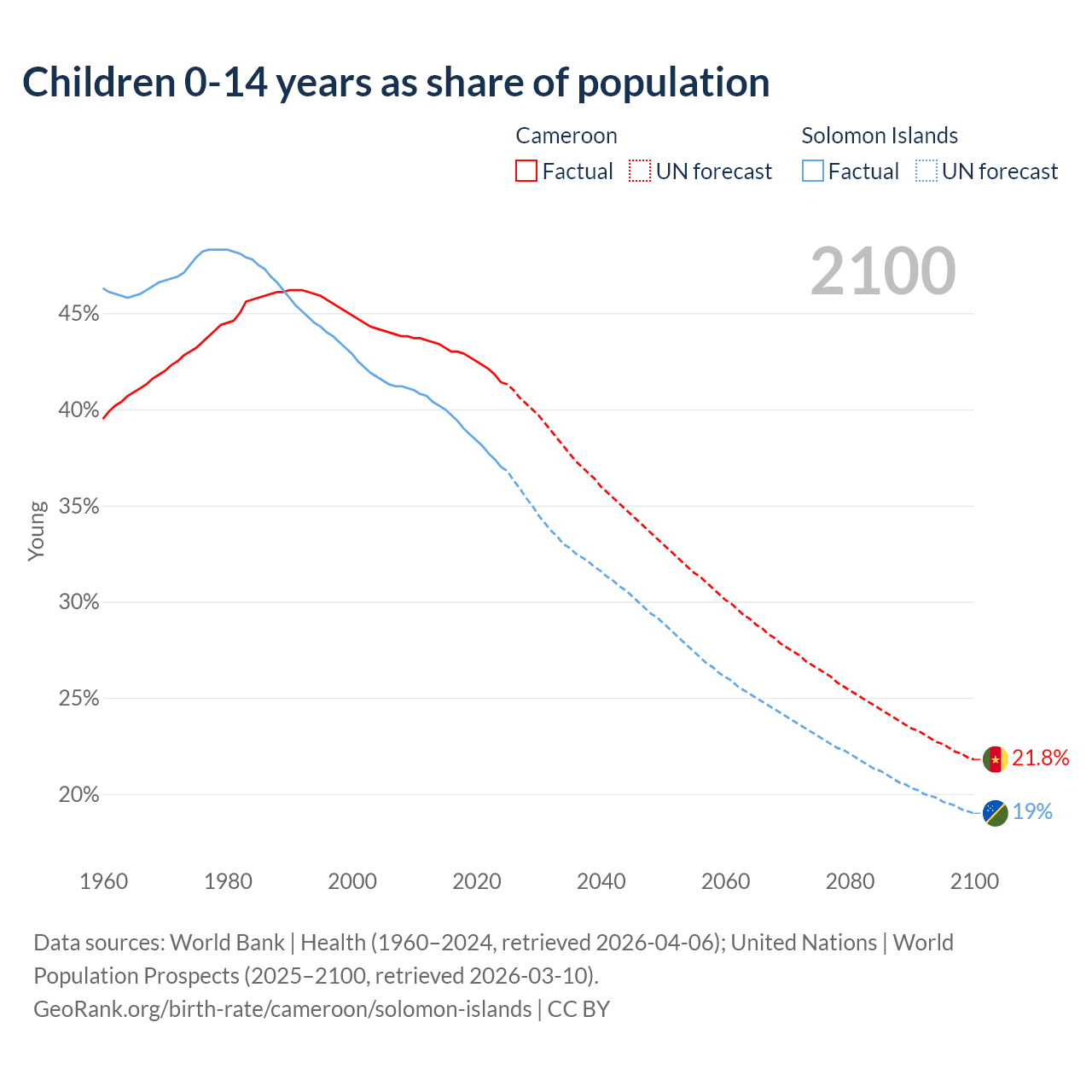According to the latest available data on birth rates, the fertility rate in Cameroon was 4.32 children per woman in 2023, compared to 3.56 in the Solomon Islands in 2023. The replacement level is considered to be 2.1 children per woman.