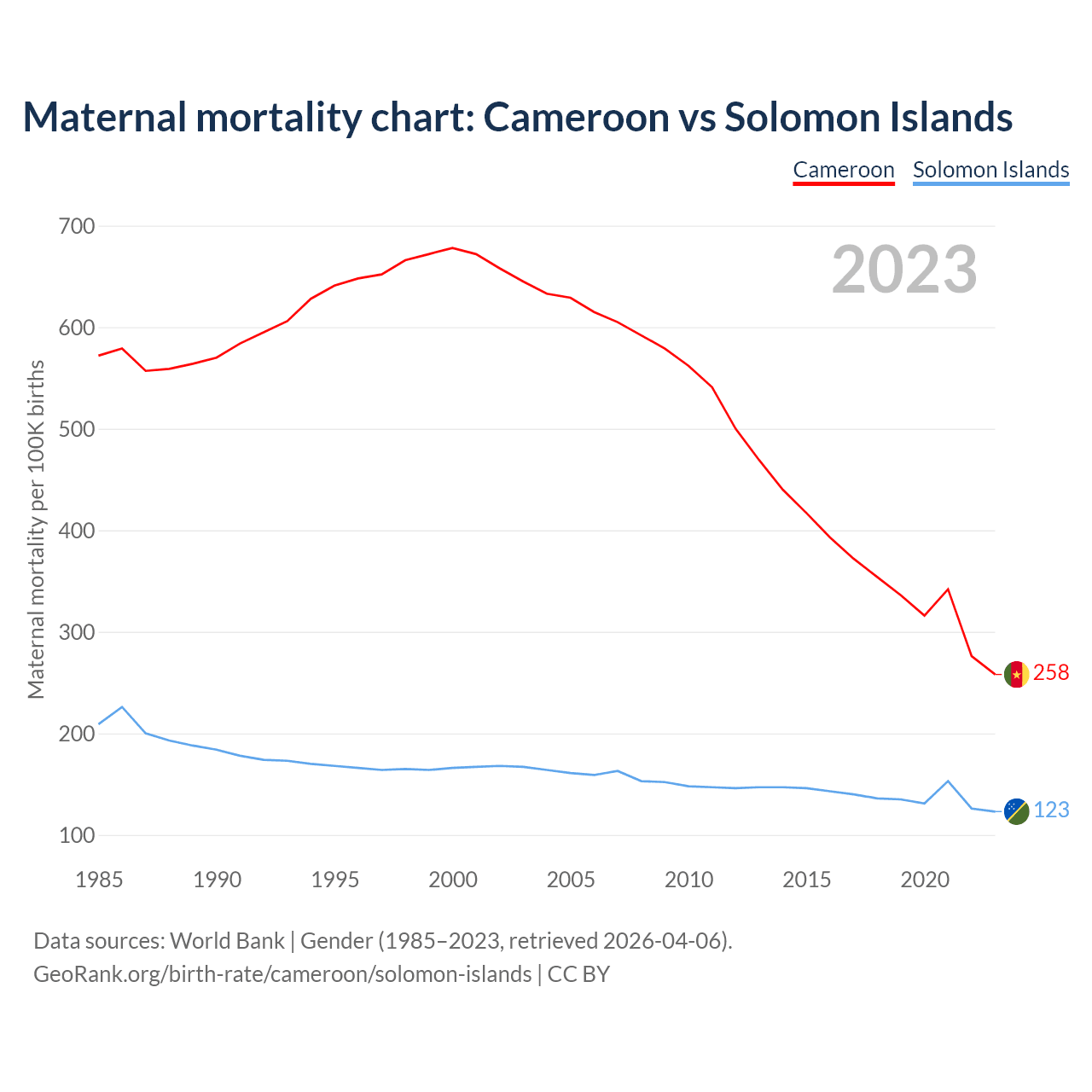 The maternal mortality rate, which is the probability of dying during childbirth or within 42 days of pregnancy termination, is 258 deaths per 100,000 live births in Cameroon, compared to 123 deaths in the Solomon Islands.