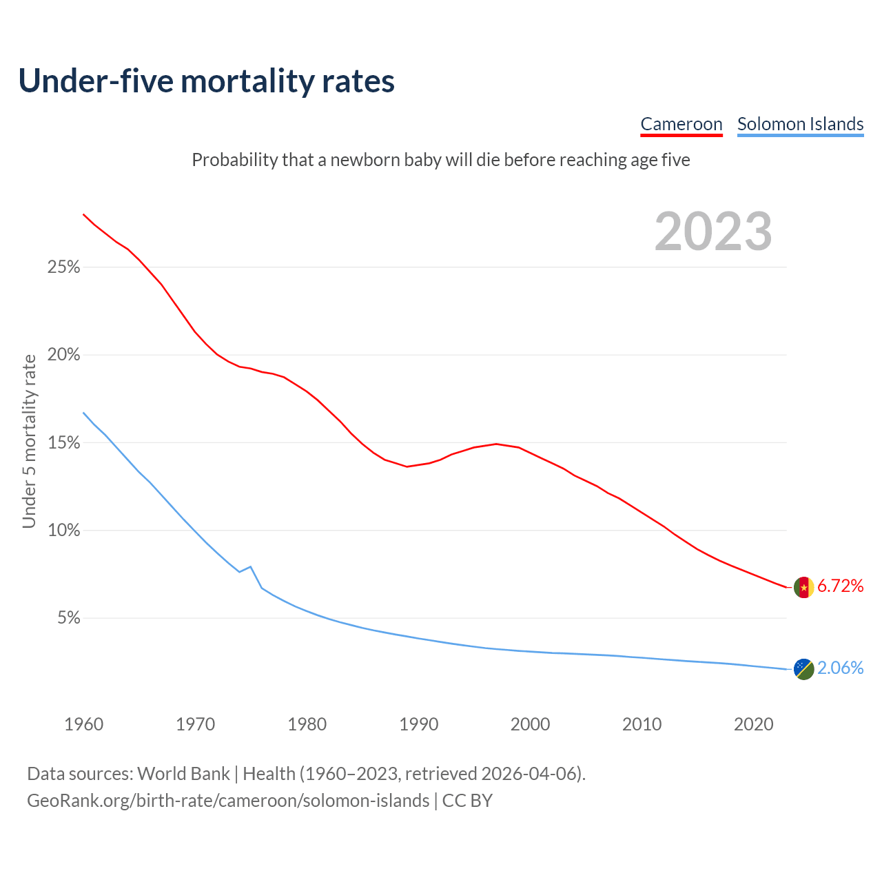 The chance that a newborn baby will die before reaching age five is 6.72% in Cameroon and 2.06% in the Solomon Islands. Above is a chart with historical data on under-five mortality rates.