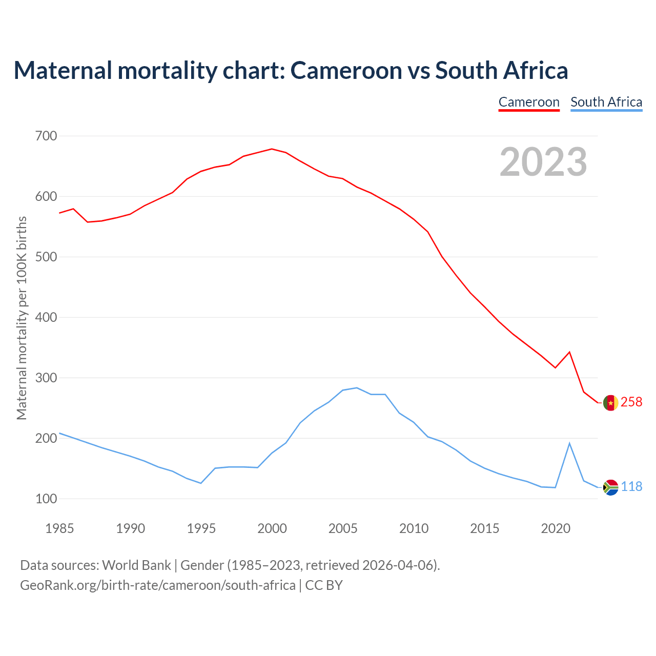The maternal mortality rate, which is the probability of dying during childbirth or within 42 days of pregnancy termination, is 258 deaths per 100,000 live births in Cameroon, compared to 118 deaths in South Africa.