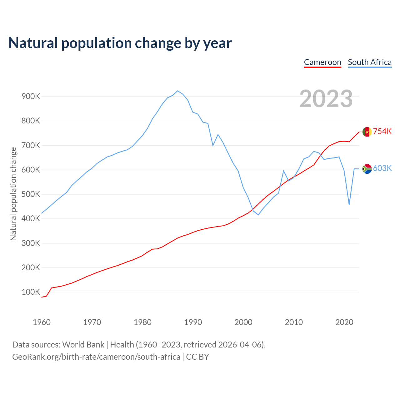 According to the latest available data on birth rates, the fertility rate in Cameroon was 4.32 children per woman in 2023, compared to 2.22 in South Africa in 2023. The replacement level is considered to be 2.1 children per woman.