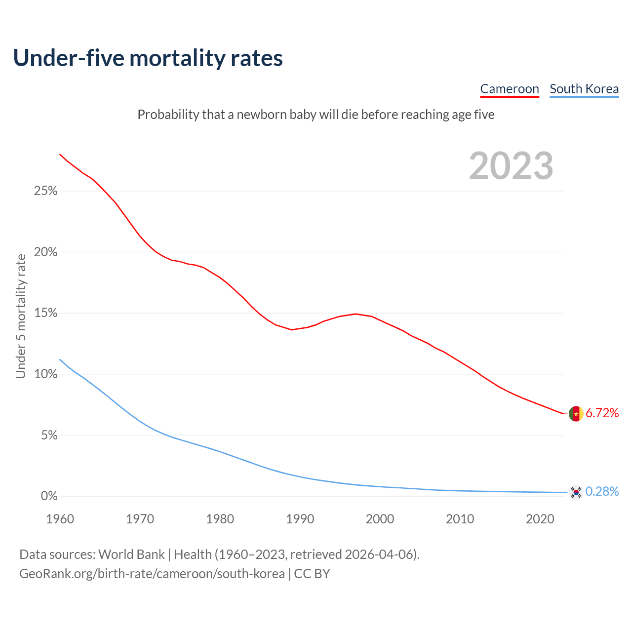 The chance that a newborn baby will die before reaching age five is 6.72% in Cameroon and 0.28% in South Korea. Above is a chart with historical data on under-five mortality rates.