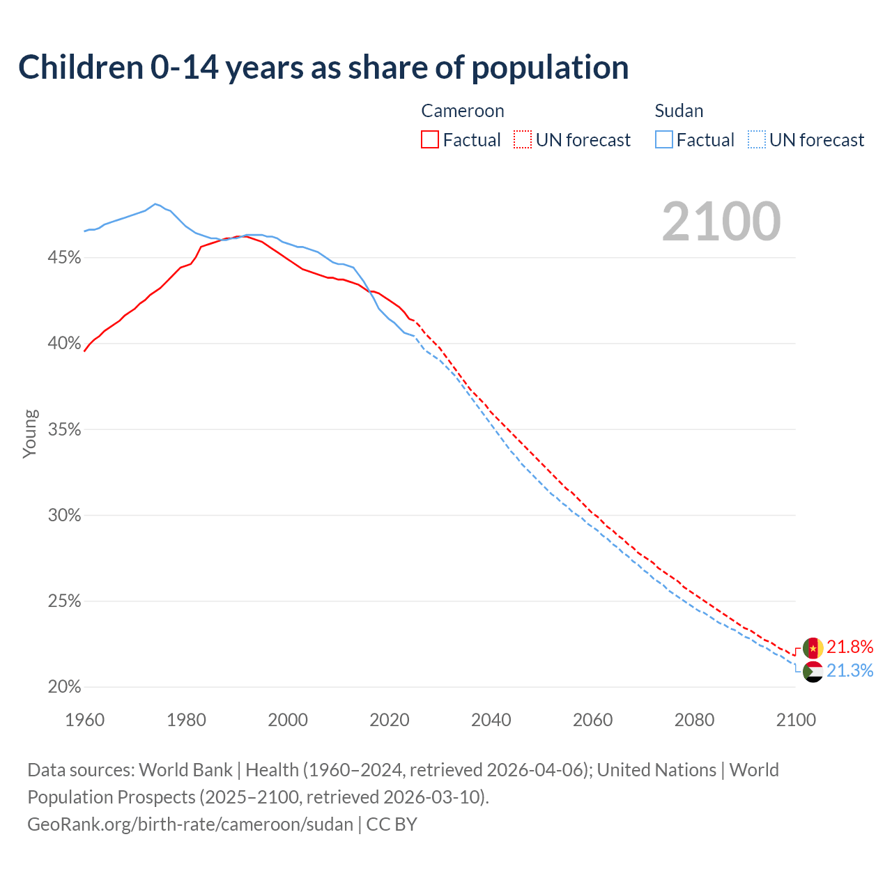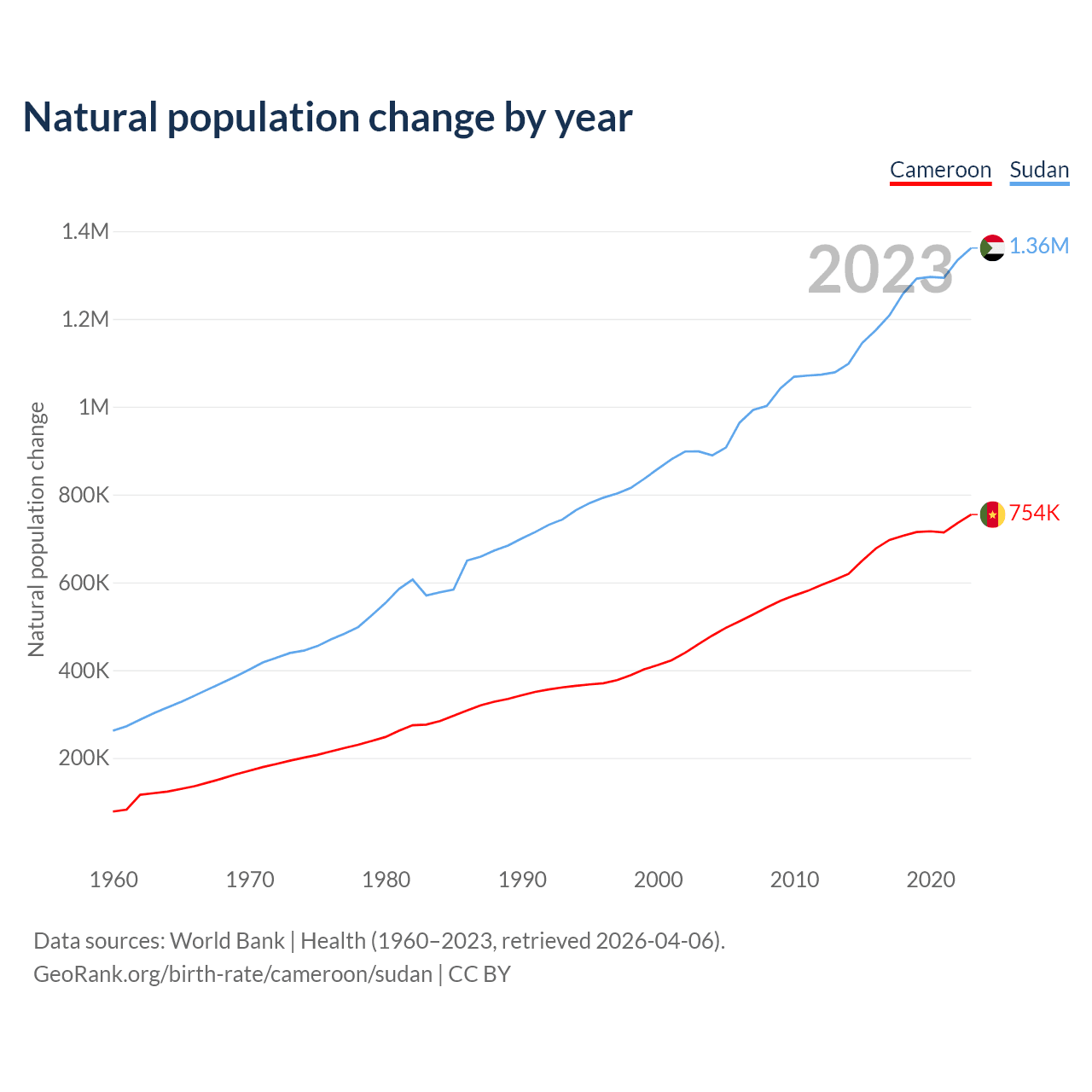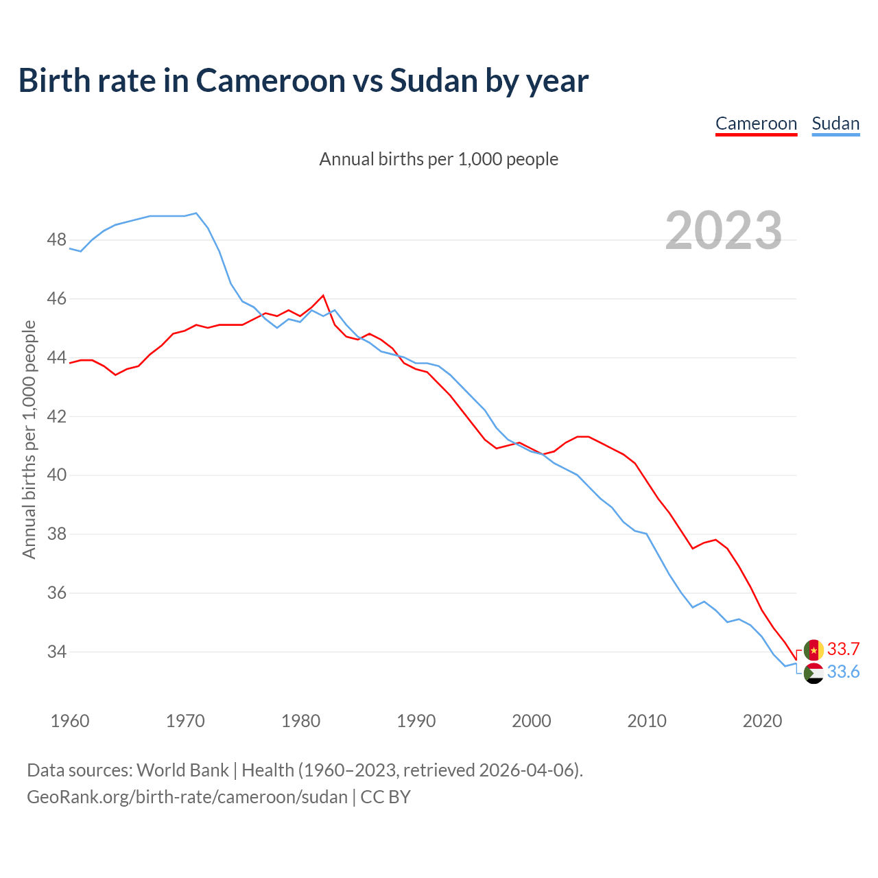 Cameroon has an annual birth rate of 33.7 births per 1,000 people, compared to 33.6 for Sudan. The average number of children a woman is expected to have during her lifetime — the fertility rate, is 4.32 in Cameroon and 4.32 in Sudan — 0.02% difference.