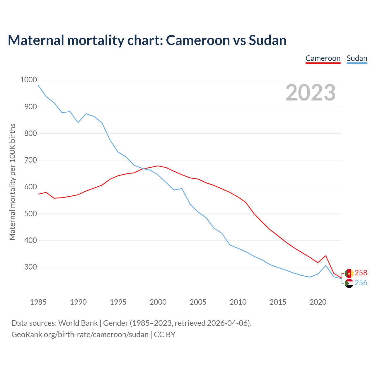 The maternal mortality rate, which is the probability of dying during childbirth or within 42 days of pregnancy termination, is 258 deaths per 100,000 live births in Cameroon, compared to 256 deaths in Sudan.