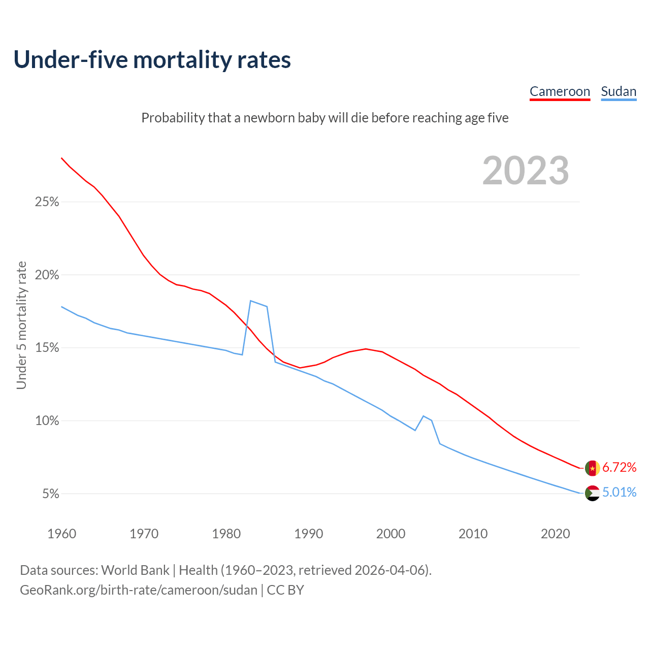The chance that a newborn baby will die before reaching age five is 6.72% in Cameroon and 5.01% in Sudan. Above is a chart with historical data on under-five mortality rates.