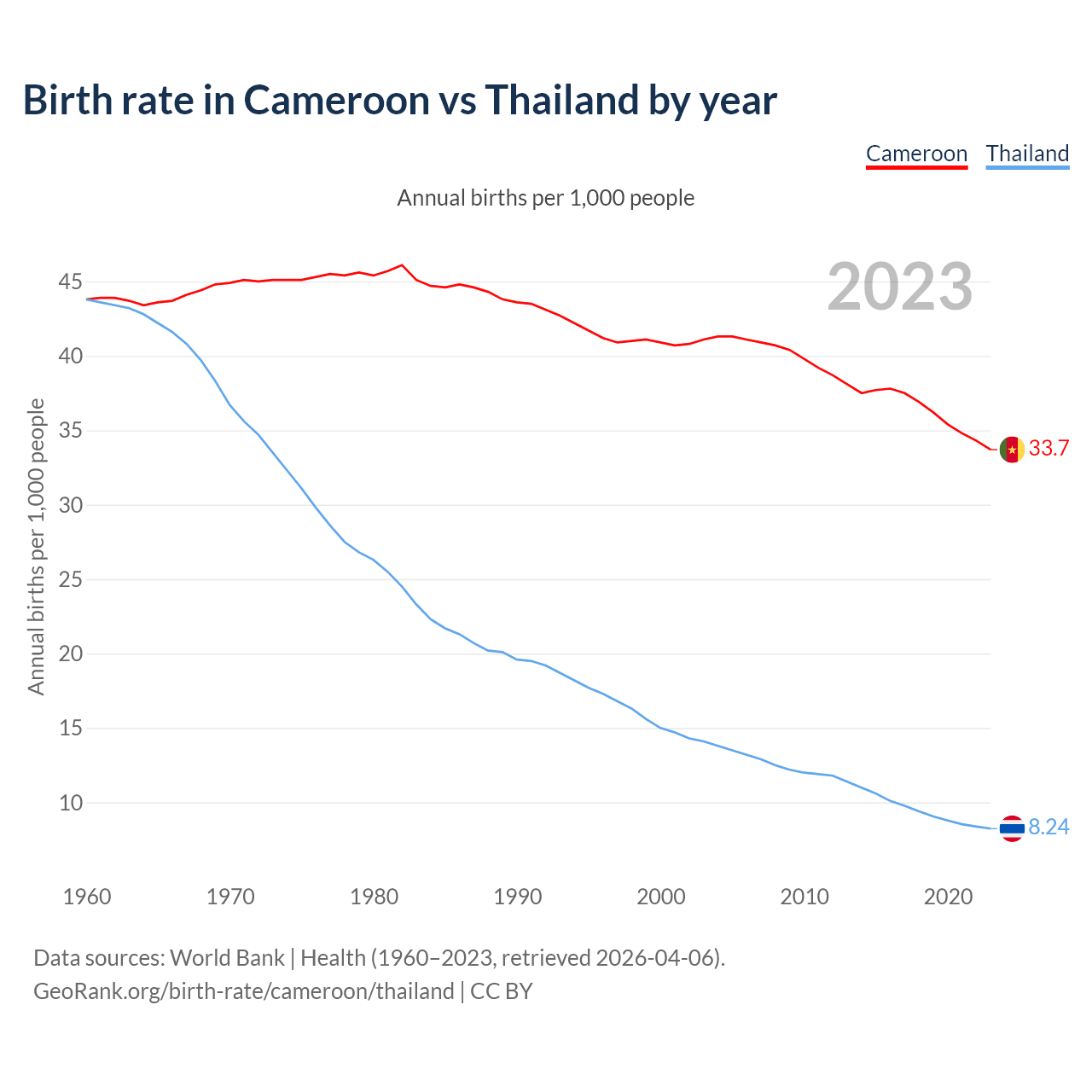 Cameroon has an annual birth rate of 33.7 births per 1,000 people, compared to 8.24 for Thailand. The average number of children a woman is expected to have during her lifetime — the fertility rate, is 4.32 in Cameroon and 1.21 in Thailand — 72% difference.