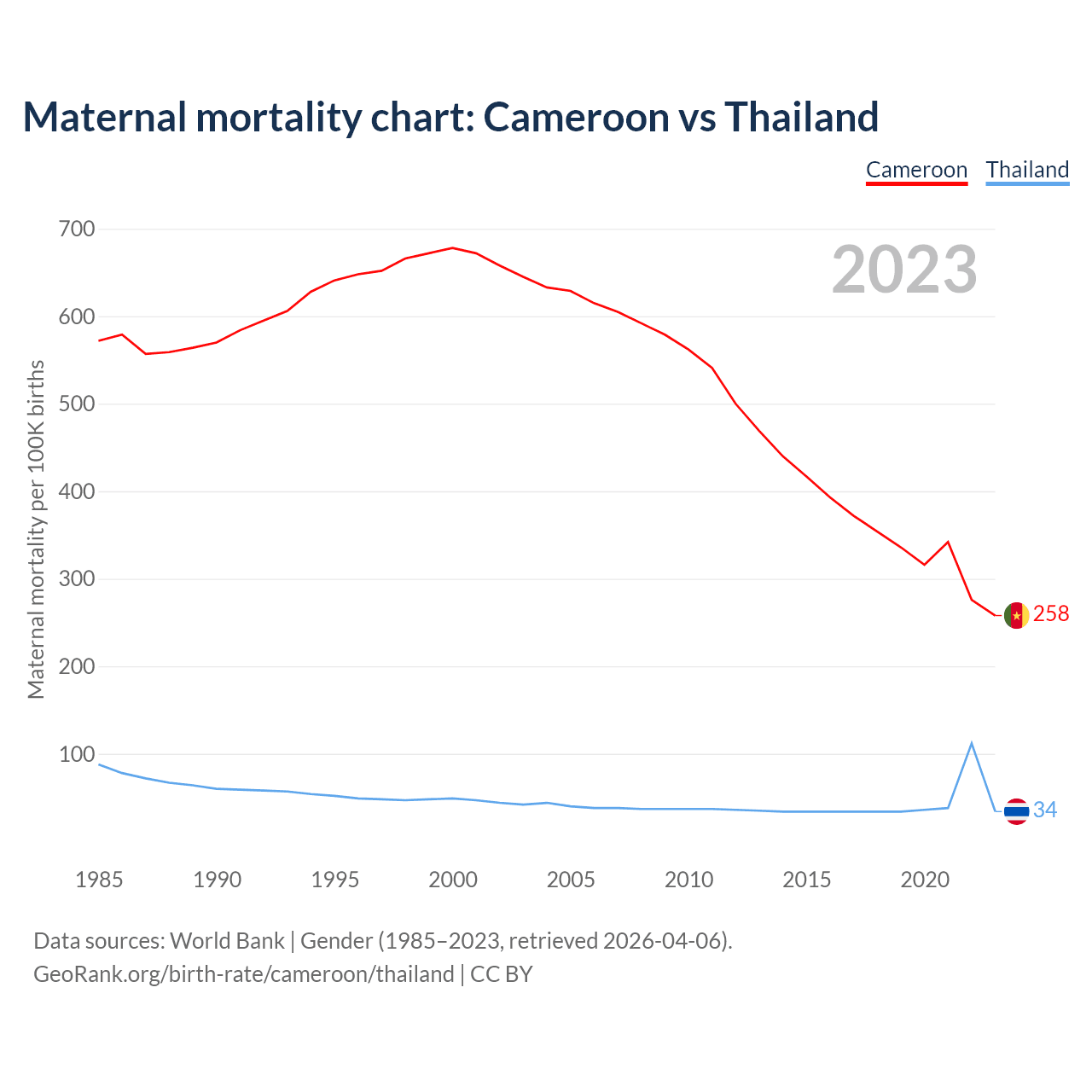 The maternal mortality rate, which is the probability of dying during childbirth or within 42 days of pregnancy termination, is 258 deaths per 100,000 live births in Cameroon, compared to 34 deaths in Thailand.