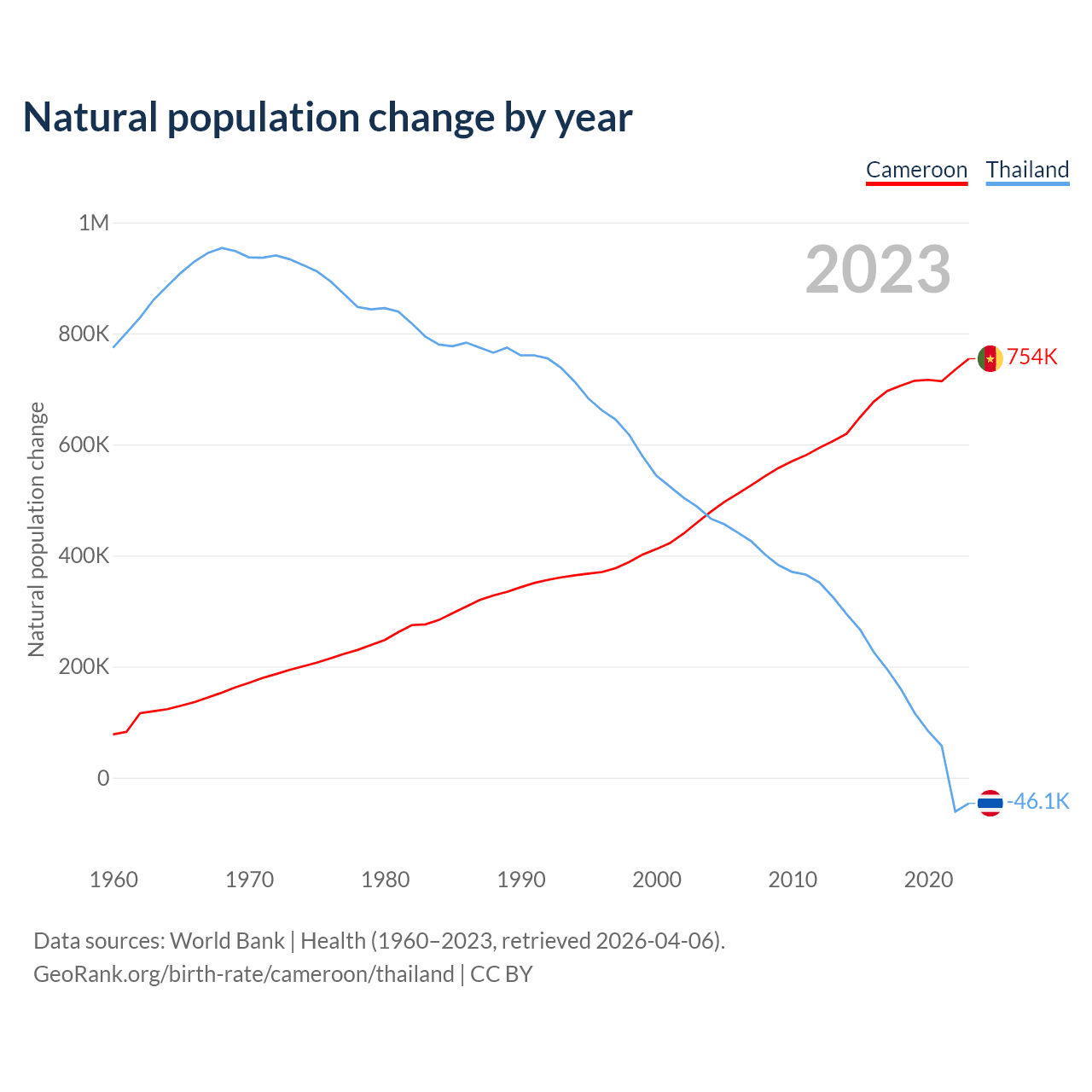 According to the latest available data on birth rates, the fertility rate in Cameroon was 4.32 children per woman in 2023, compared to 1.21 in Thailand in 2023. The replacement level is considered to be 2.1 children per woman.