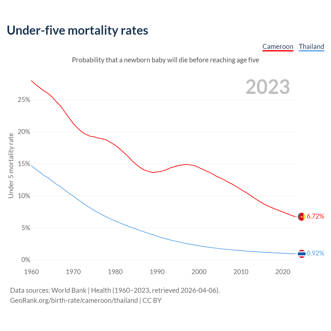 The chance that a newborn baby will die before reaching age five is 6.72% in Cameroon and 0.92% in Thailand. Above is a chart with historical data on under-five mortality rates.