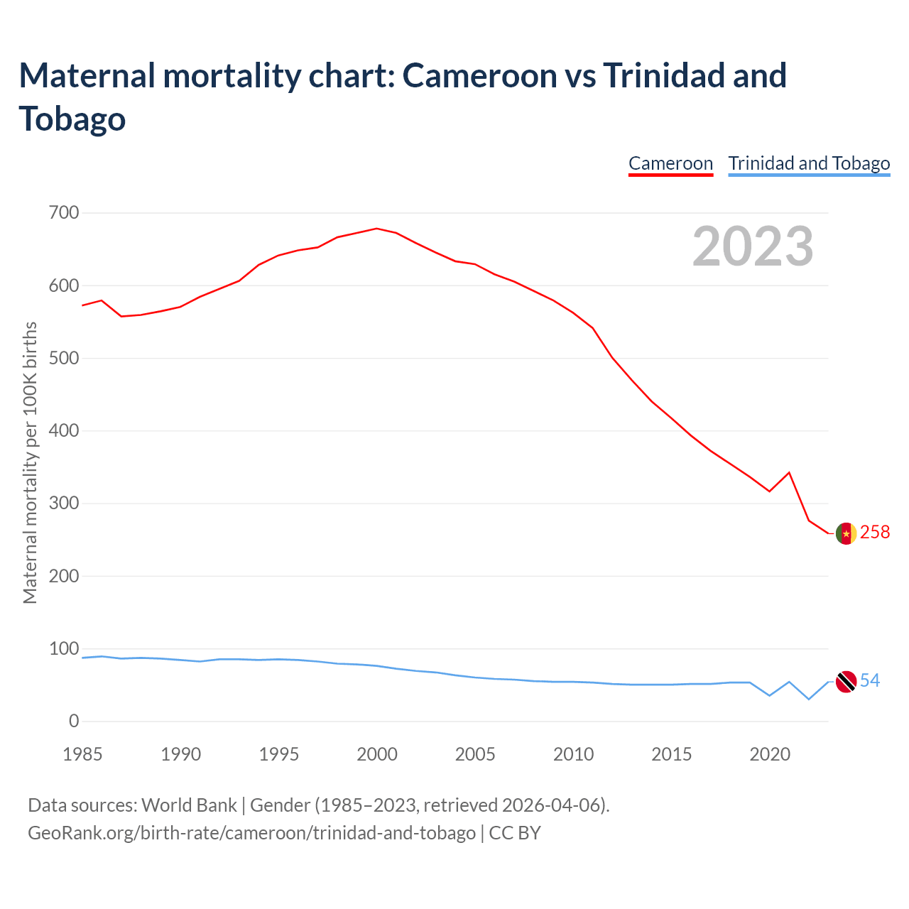 The maternal mortality rate, which is the probability of dying during childbirth or within 42 days of pregnancy termination, is 258 deaths per 100,000 live births in Cameroon, compared to 54 deaths in Trinidad and Tobago.