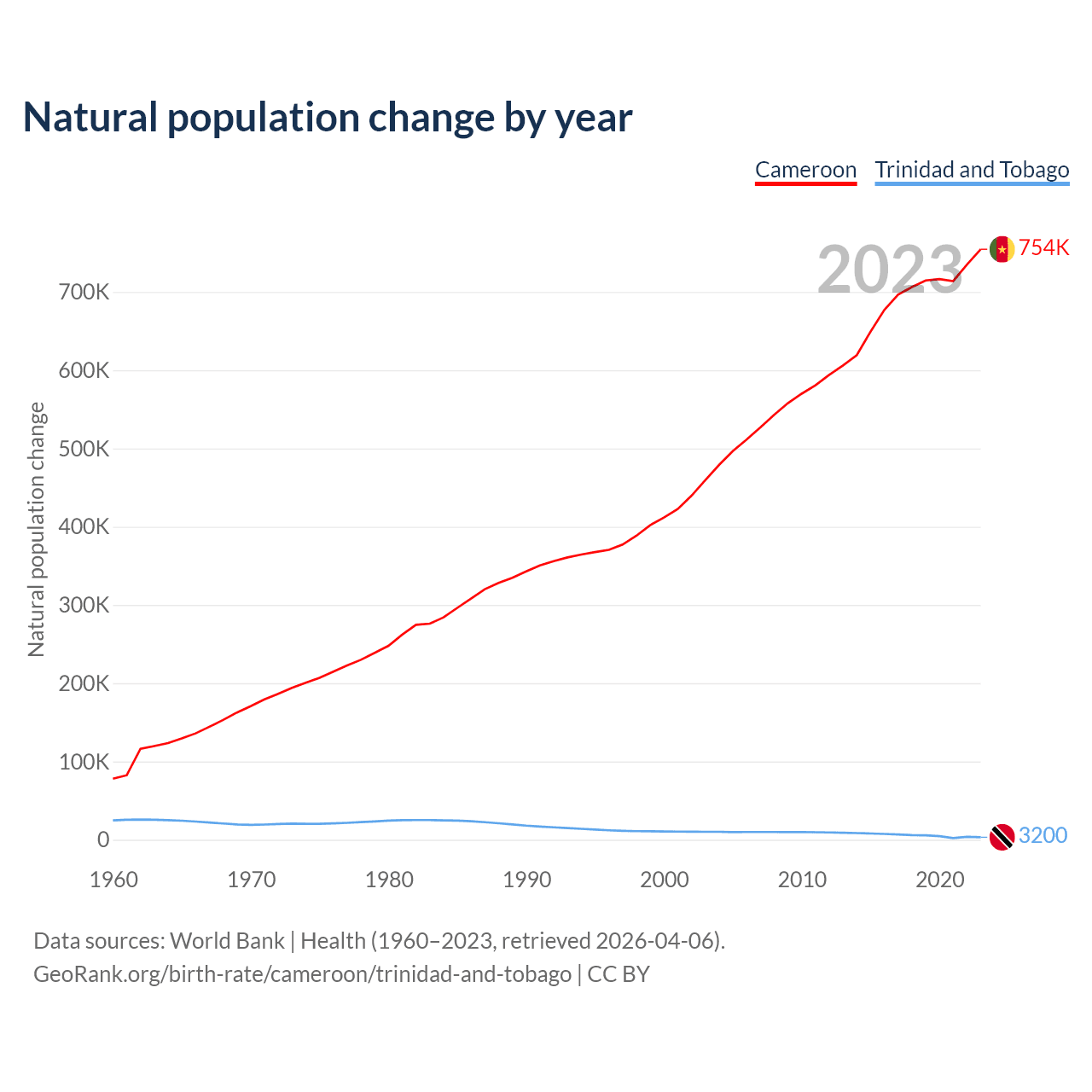 Cameroon has an annual birth rate of 33.7 births per 1,000 people, compared to 10.7 for Trinidad and Tobago. The average number of children a woman is expected to have during her lifetime — the fertility rate, is 4.32 in Cameroon and 1.53 in Trinidad and Tobago — 64.6% difference.