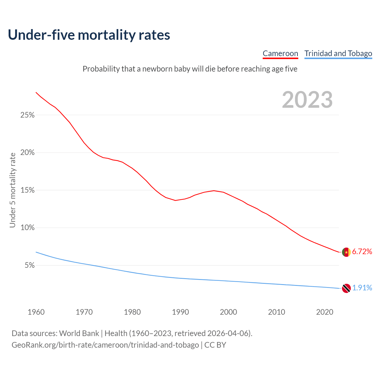 The chance that a newborn baby will die before reaching age five is 6.72% in Cameroon and 1.91% in Trinidad and Tobago. Above is a chart with historical data on under-five mortality rates.