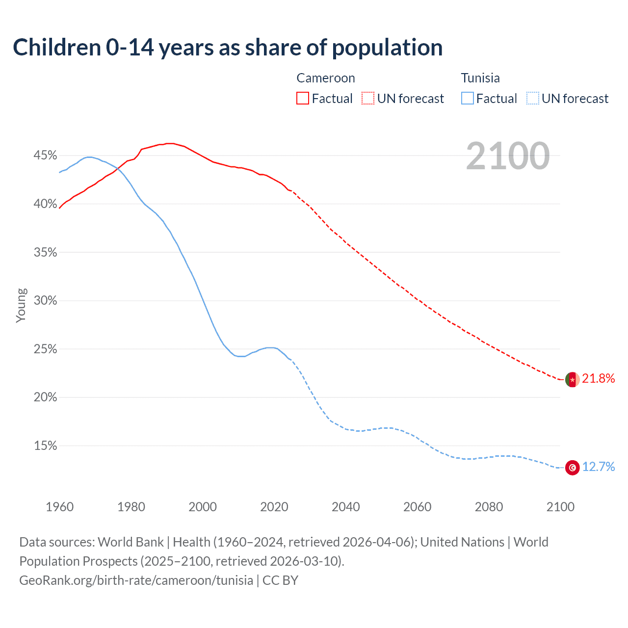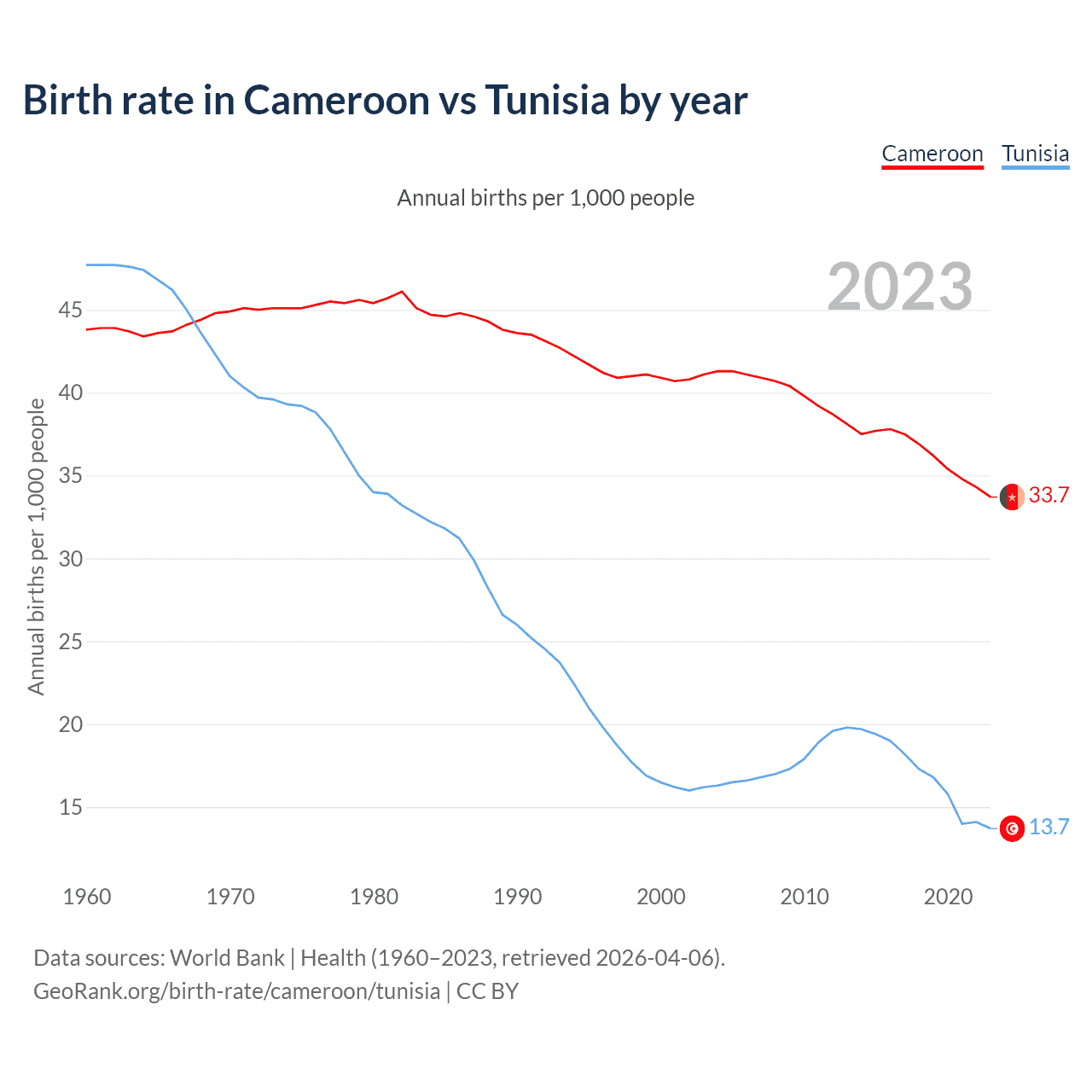 Cameroon has an annual birth rate of 33.7 births per 1,000 people, compared to 13.7 for Tunisia. The average number of children a woman is expected to have during her lifetime — the fertility rate, is 4.32 in Cameroon and 1.83 in Tunisia — 57.6% difference.