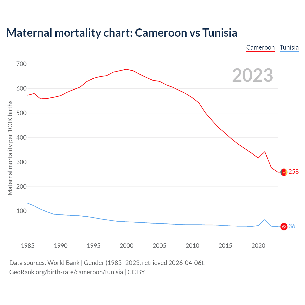 The maternal mortality rate, which is the probability of dying during childbirth or within 42 days of pregnancy termination, is 258 deaths per 100,000 live births in Cameroon, compared to 36 deaths in Tunisia.