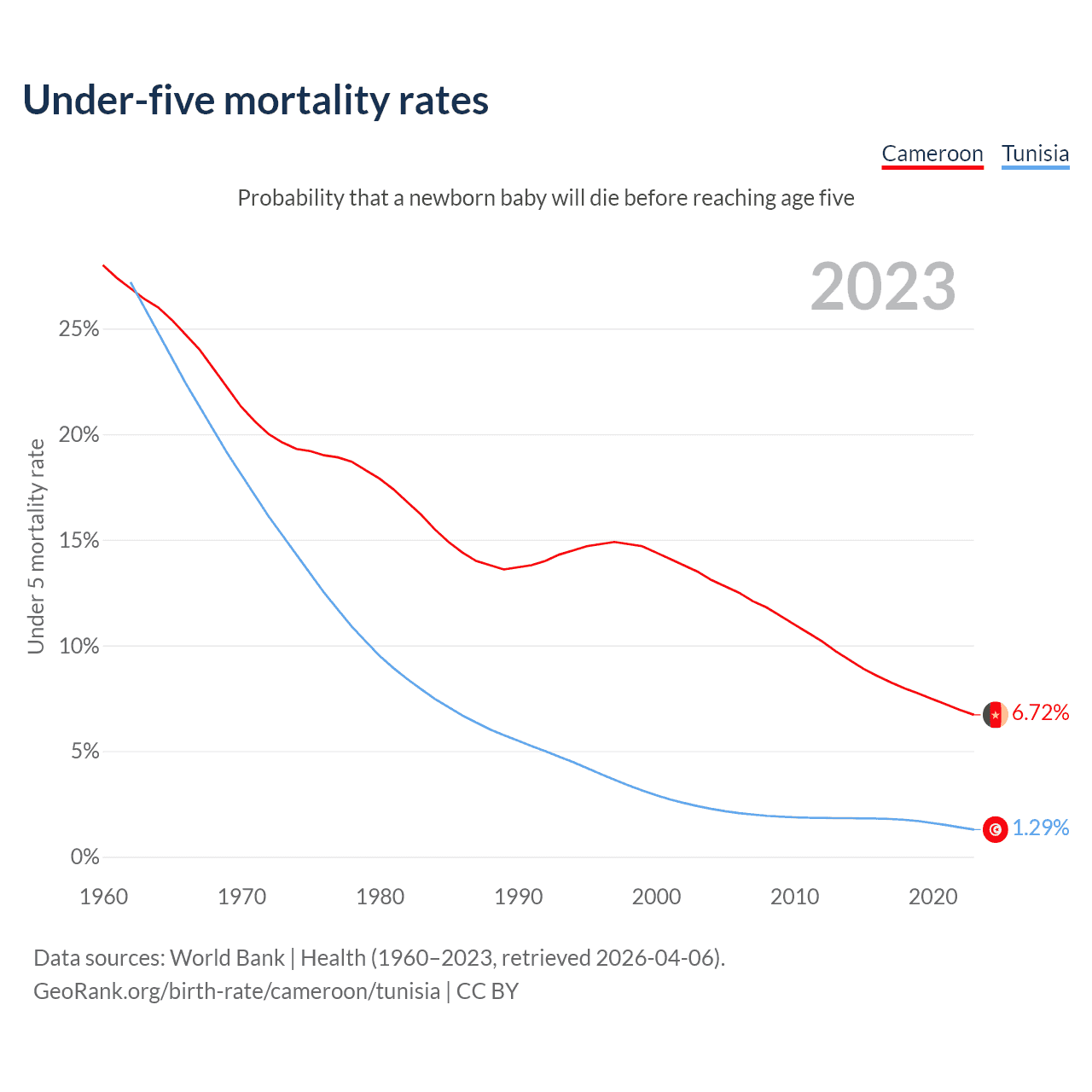 The chance that a newborn baby will die before reaching age five is 6.72% in Cameroon and 1.29% in Tunisia. Above is a chart with historical data on under-five mortality rates.