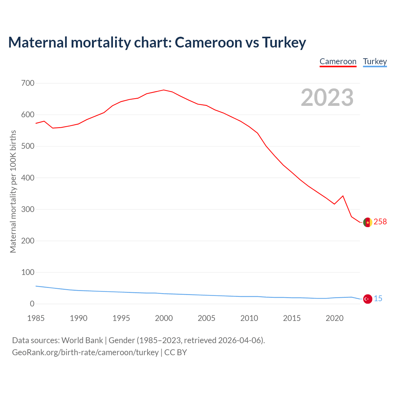The maternal mortality rate, which is the probability of dying during childbirth or within 42 days of pregnancy termination, is 258 deaths per 100,000 live births in Cameroon, compared to 15 deaths in Turkey.
