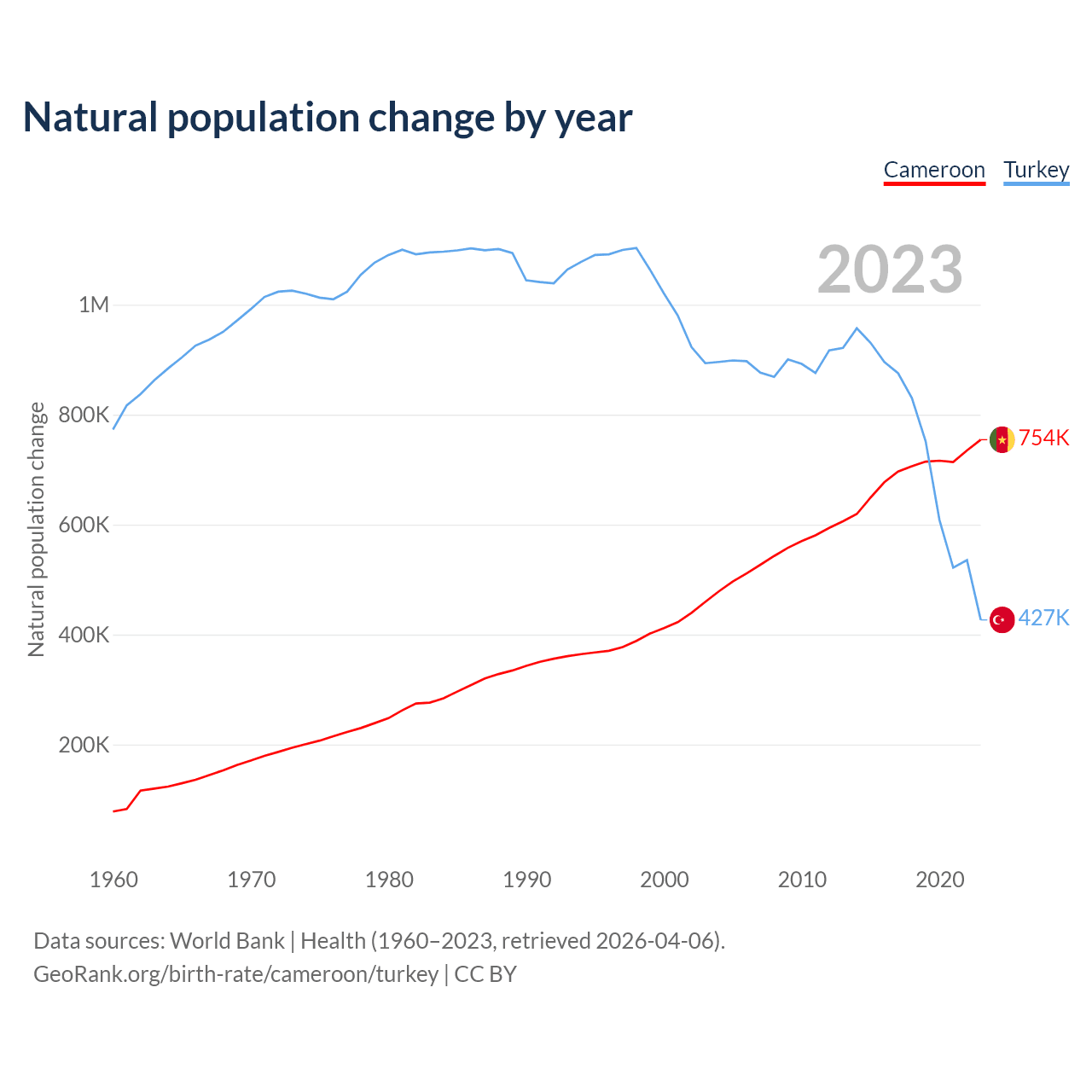 According to the latest available data on birth rates, the fertility rate in Cameroon was 4.32 children per woman in 2023, compared to 1.51 in Turkey in 2023. The replacement level is considered to be 2.1 children per woman.