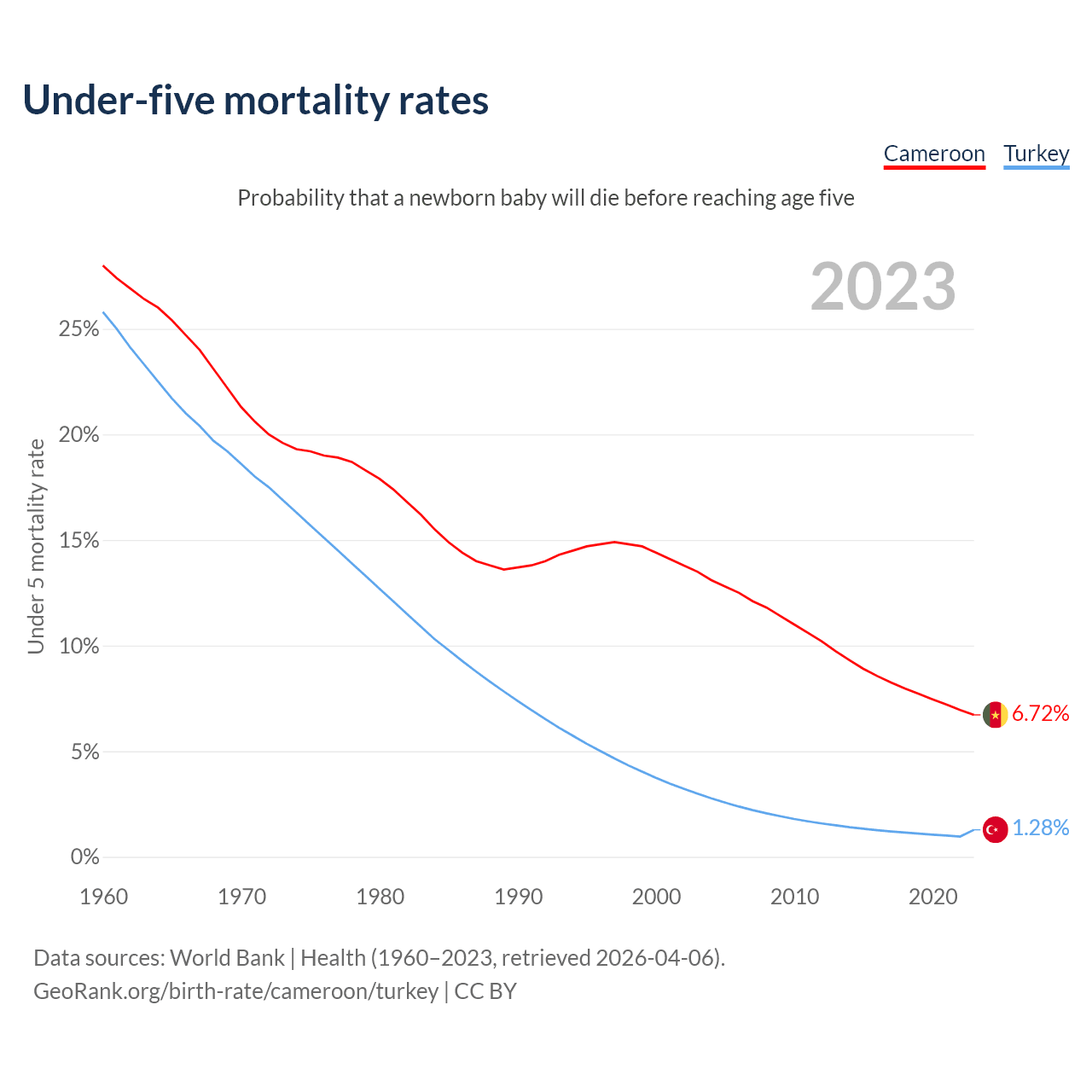 The chance that a newborn baby will die before reaching age five is 6.72% in Cameroon and 1.28% in Turkey. Above is a chart with historical data on under-five mortality rates.