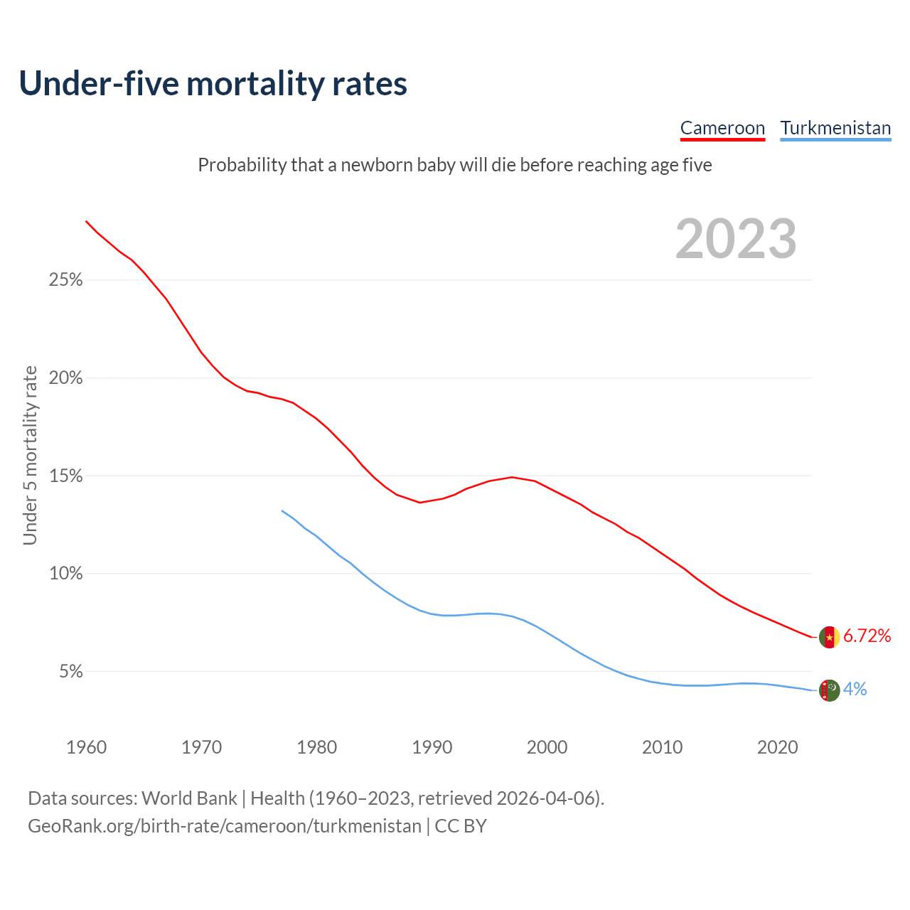 The chance that a newborn baby will die before reaching age five is 6.72% in Cameroon and 4% in Turkmenistan. Above is a chart with historical data on under-five mortality rates.