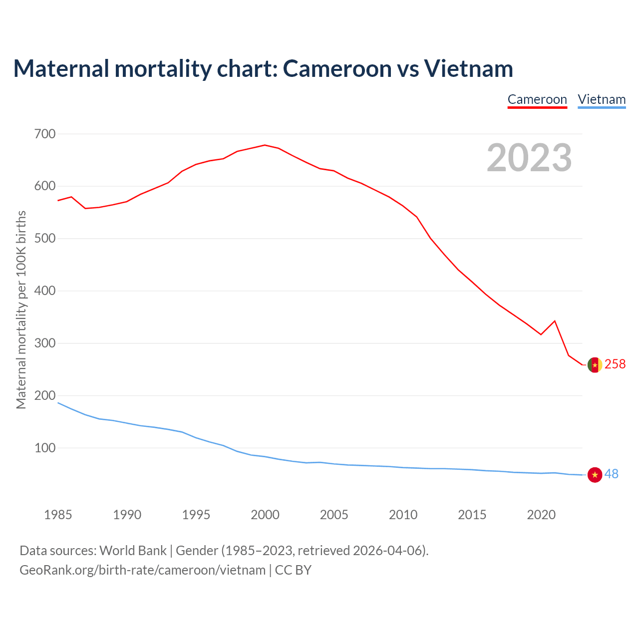 The maternal mortality rate, which is the probability of dying during childbirth or within 42 days of pregnancy termination, is 258 deaths per 100,000 live births in Cameroon, compared to 48 deaths in Vietnam.
