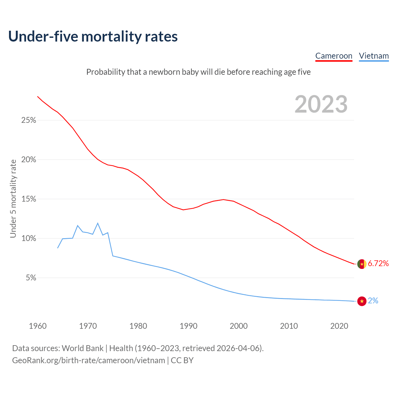 The chance that a newborn baby will die before reaching age five is 6.72% in Cameroon and 2% in Vietnam. Above is a chart with historical data on under-five mortality rates.