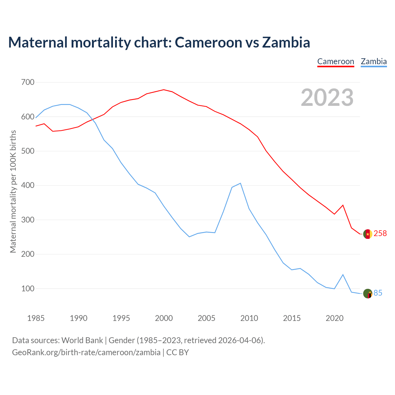 The maternal mortality rate, which is the probability of dying during childbirth or within 42 days of pregnancy termination, is 258 deaths per 100,000 live births in Cameroon, compared to 85 deaths in Zambia.