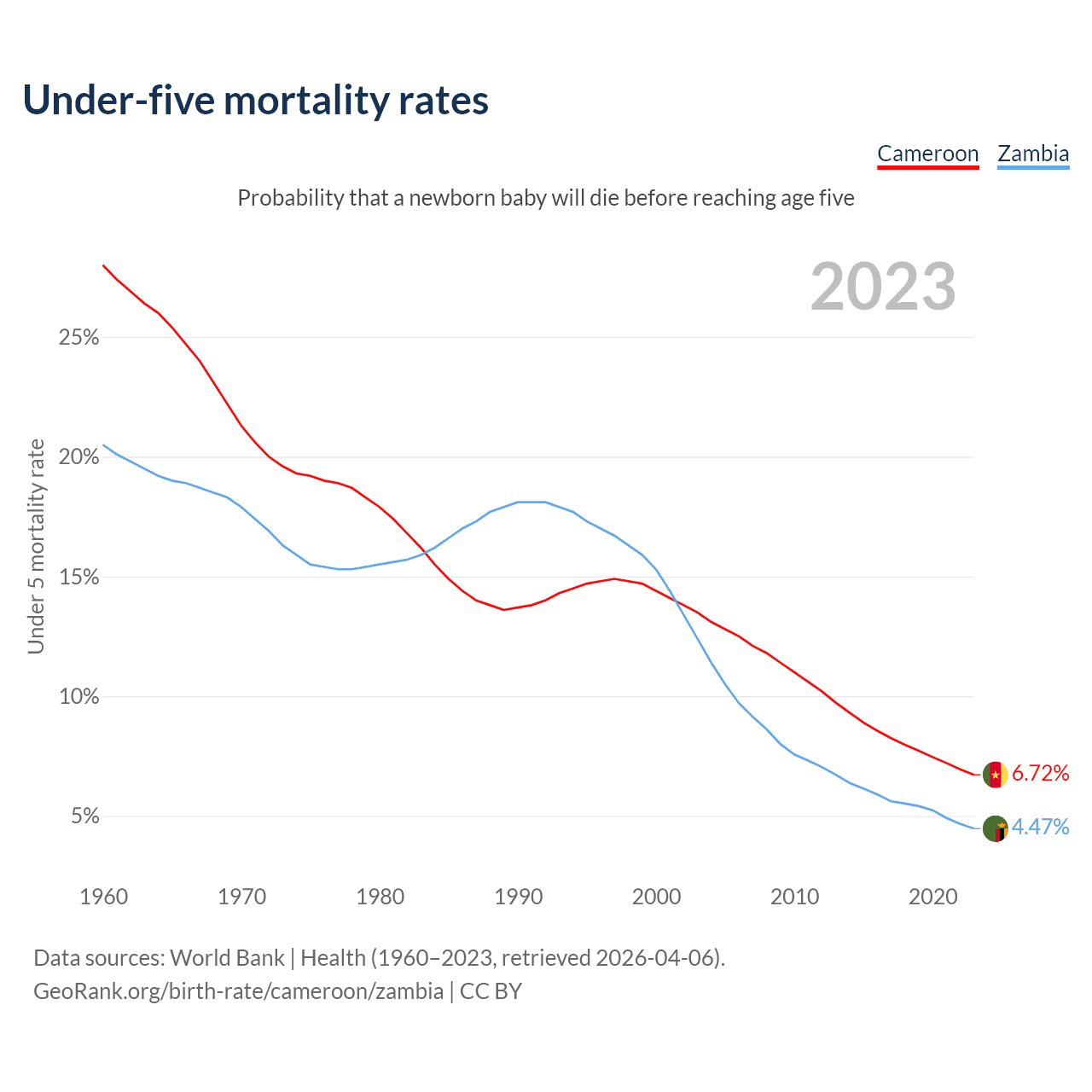 The chance that a newborn baby will die before reaching age five is 6.72% in Cameroon and 4.47% in Zambia. Above is a chart with historical data on under-five mortality rates.