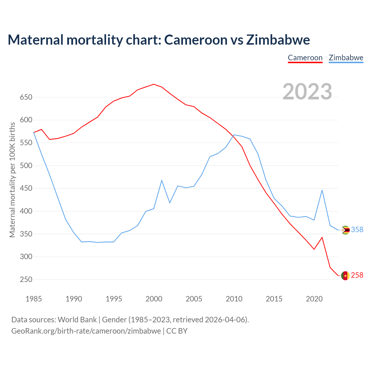 The maternal mortality rate, which is the probability of dying during childbirth or within 42 days of pregnancy termination, is 258 deaths per 100,000 live births in Cameroon, compared to 358 deaths in Zimbabwe.