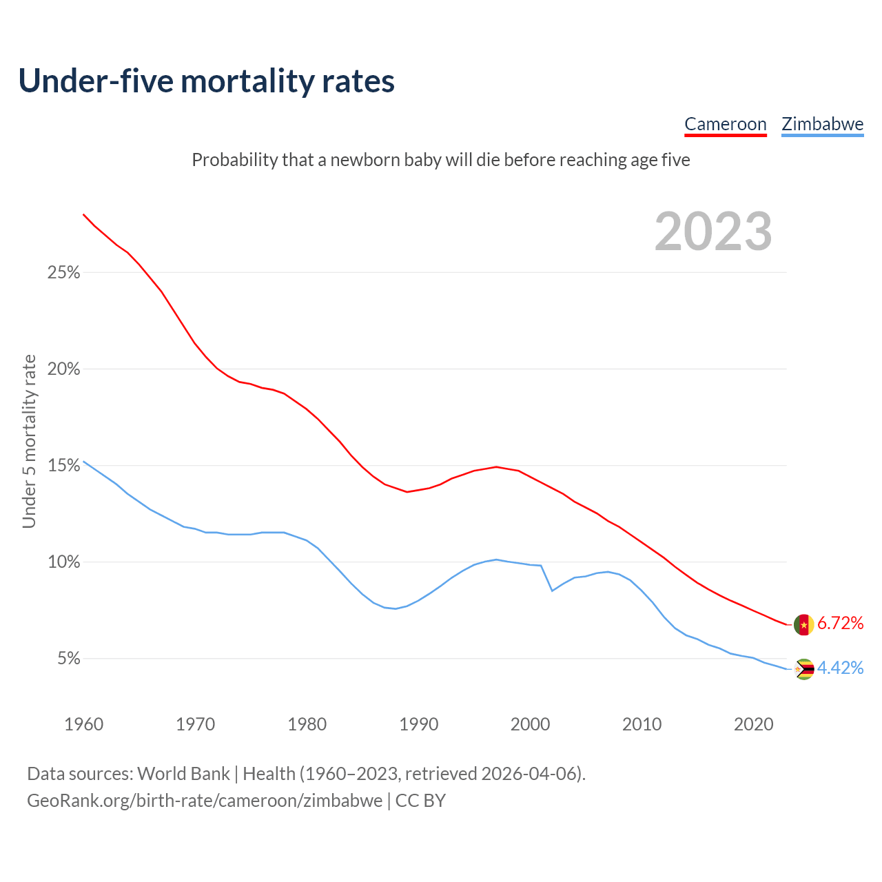 The chance that a newborn baby will die before reaching age five is 6.72% in Cameroon and 4.42% in Zimbabwe. Above is a chart with historical data on under-five mortality rates.